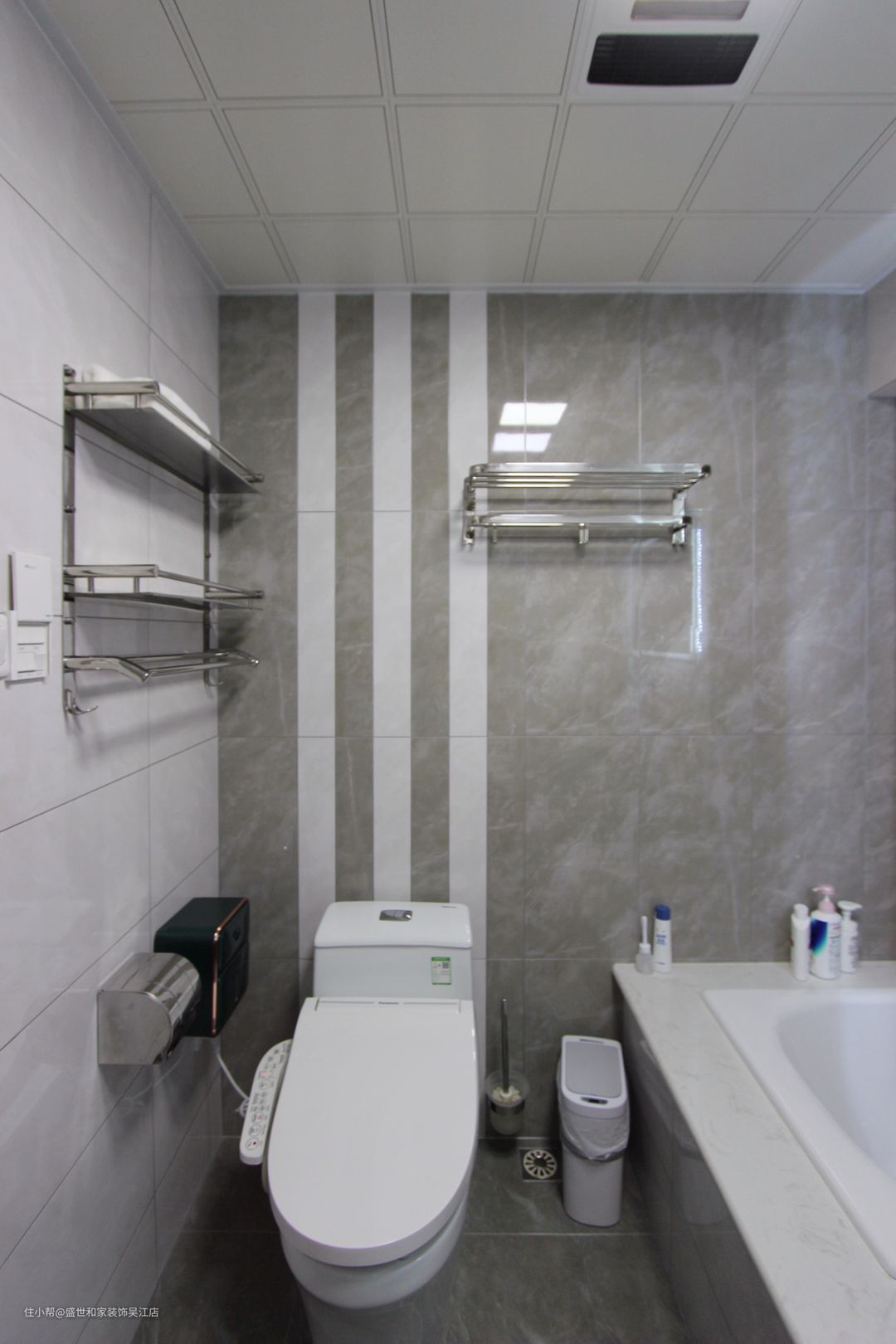 马桶紧挨浴缸,墙面处理很巧妙,利用白色线条区分功能区。上方置物架,可以放置洗浴用品,也可以放置毛巾、小件衣服等。