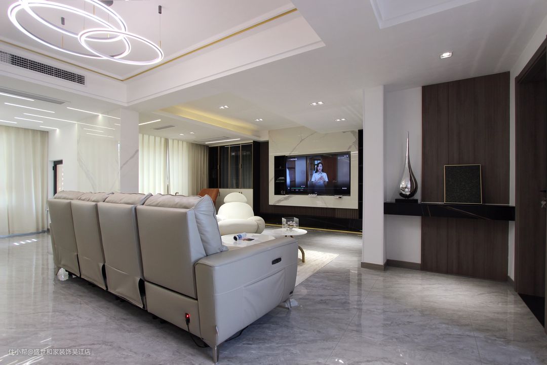 吊顶非常特别,用了金属装饰线条进行勾勒,十分精致。轻奢圆环艺术吊灯,让空间极具氛围感。