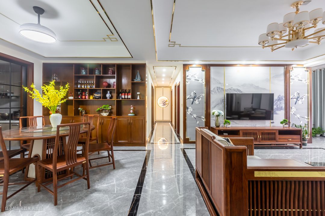 家居的公共区域 充满着浓郁的中式风情 目之所及 都是原木色的中式家具柔润的线条 地面波导线勾勒出空间的区隔 顶面的金属线条 以中式回文格进行勾勒 与空间的整体设计遥相呼应