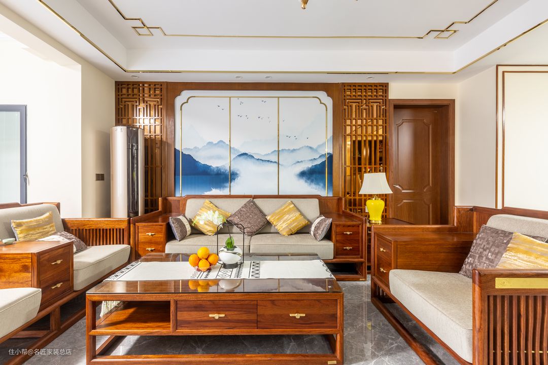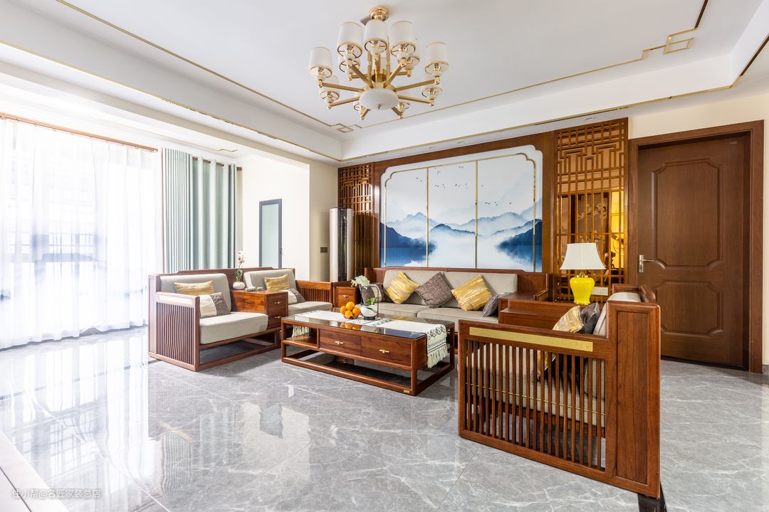 客厅沙发背景 采用中式风格的定制木格栅 与定制家具 以中轴对称的方式 塑造出规整大气的客厅空间 嵌入其中的山水画面 以东方美学的朦胧意韵 让空间增加亮色
