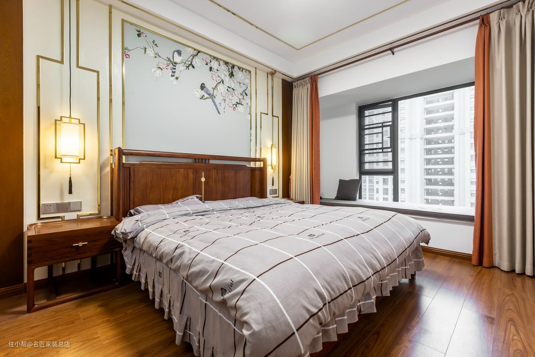 静谧如森林的原木色主卧 营造天然而安宁的睡眠环境 中式风格花鸟画作为墙面背景 以定制中式线框镶嵌 使得空间充满浓随的东方美学意境