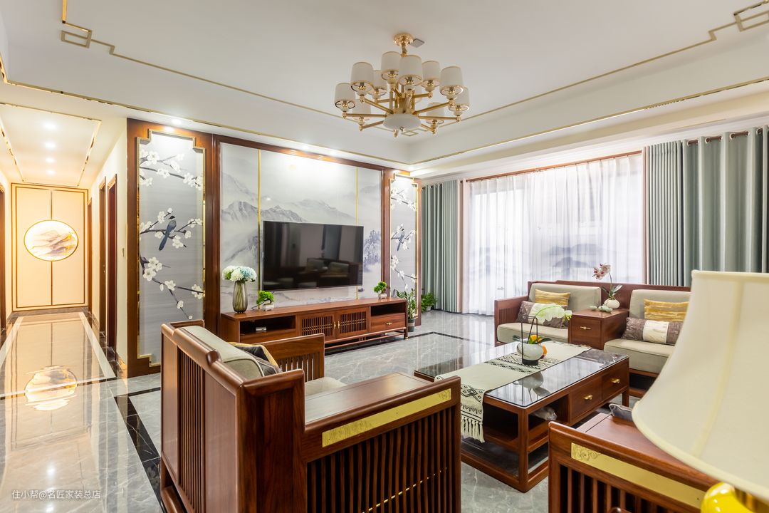 客厅电视背景 采用花鸟画的设计 嵌以定制中式边框线 搭配中式风格电视柜 呈现出简明舒适的开放空间
