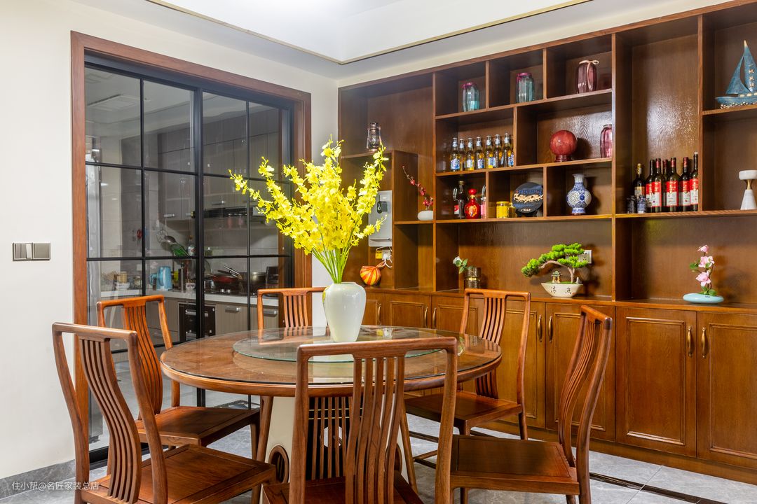 仍延伸了居室的中式风格基调 圆形餐桌 延展于三餐四季的幸福感 半开放式餐边柜 给居室呈现出更为舒适而具实用性的观感 平凡岁月的朝夕相处 自是生活中的不凡体验