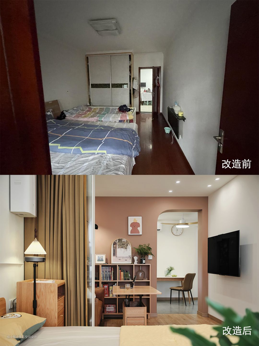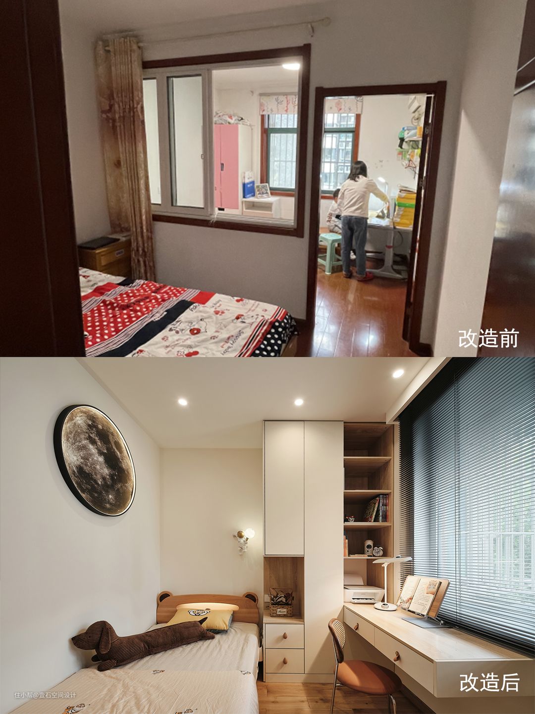 这是为了孩子上学买的老破小学区房,装修前一家人都不太想住,一家人商量后决定重新装修,毕竟孩子在这里要上学好几年,不能错过孩子的童年。 小姐姐是在网络知道我们,经过交流后,觉得我们的设计比较满足他们的需要,于是和我们确定了合作。老小区设计改造,注意事项还是比较多的,常遇到的是空间分布不合理,还有采光的问题等,都需要考虑全面。 对于风格小姐姐也有自己的想法,不追求特定的风格,家里的色彩、用材等元素遵从家人的喜欢,让一家三口人住的自由舒适。 经过改造后,三口之家不需要3间卧室,于是我们把原来比较拥挤的3个卧室改造成2间卧室,与之多出了多功能客厅书房,还有一个储物式衣帽间,改造后一家人都更喜欢住在这个家,而且小盆友也喜欢邀请同学们来家里做客啦。