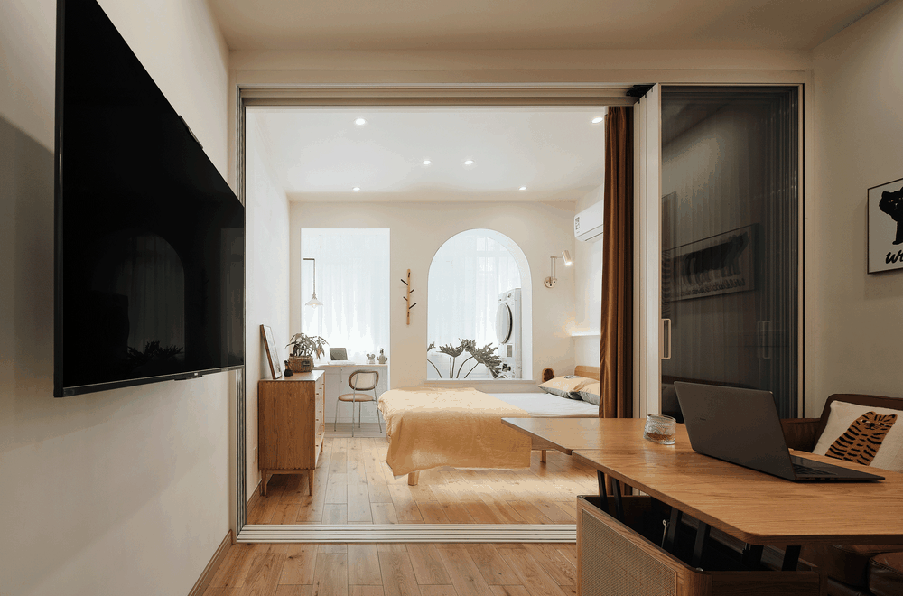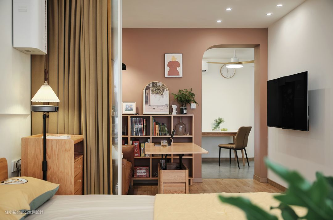 改造后的多功能客厅书房,是家里使用频率很高的空间,这张书桌可以缩成一个小茶几,需要办公的时候,它就是一张办公桌。这个电视也是可以旋转的,可以坐在沙发看电视,也可以躺在床铺看电视,很人性化的设计。