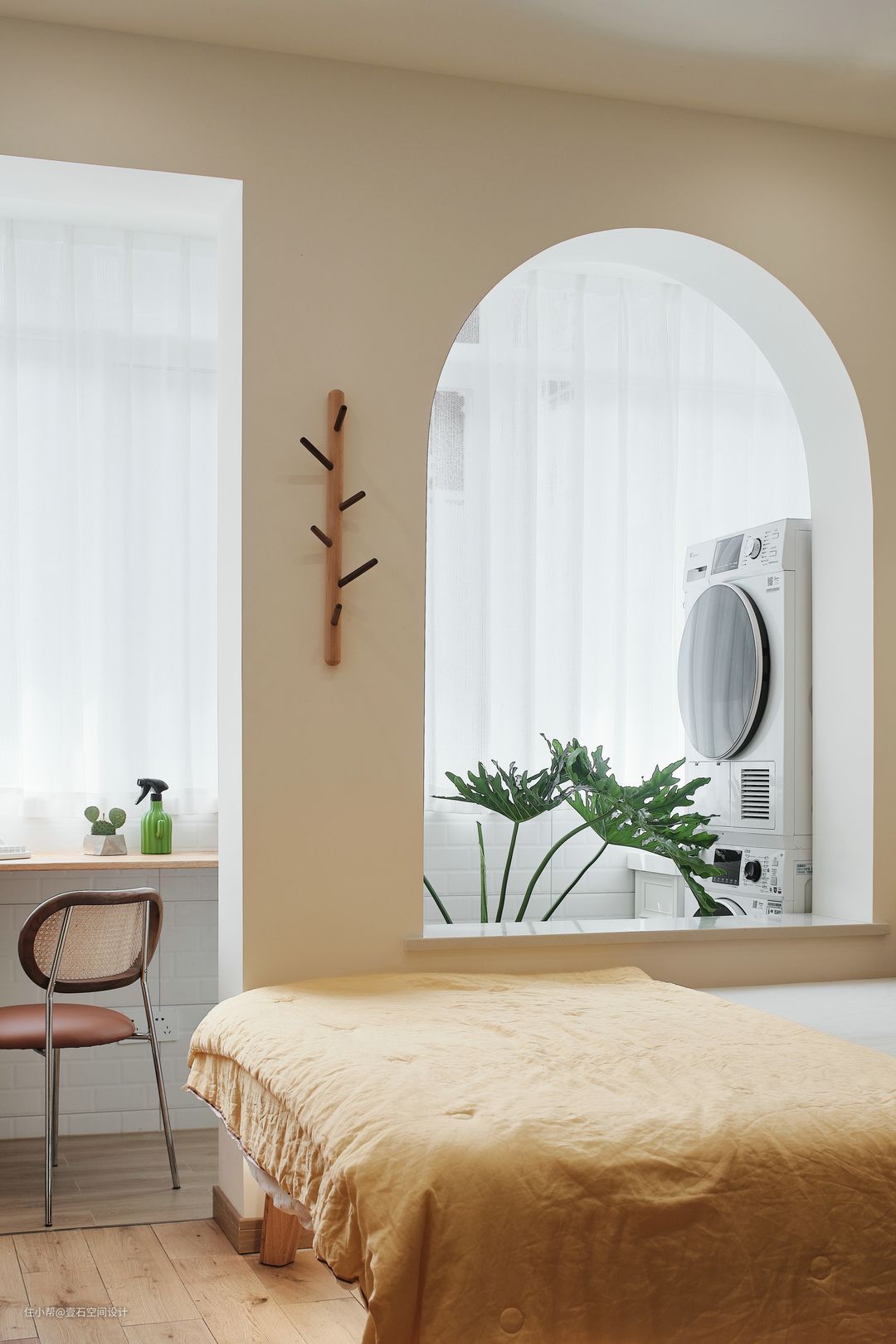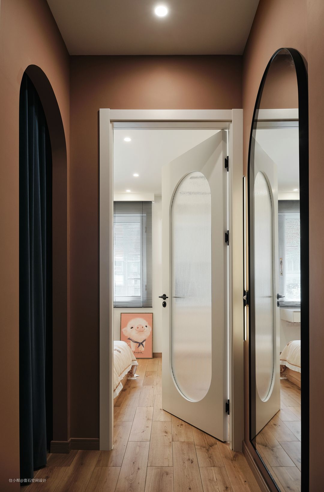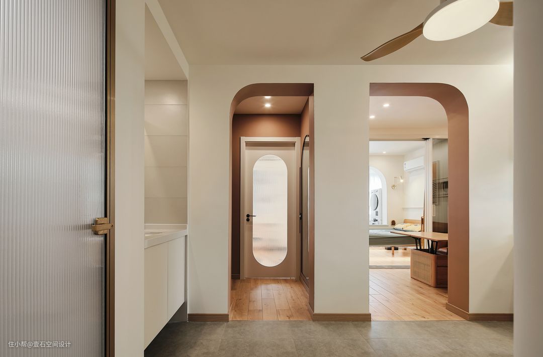 小空间我们把家里尽可能打开,两面弧型门洞各自通往小朋友房间和主卧室房间,干区设在外面,长虹玻璃门里面是马桶区和淋浴区。