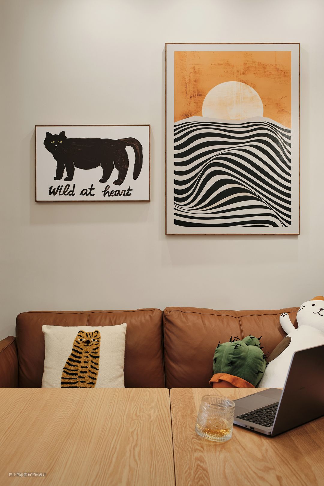 橙色皮质沙发,木色书桌,把这个空间营造的很温馨。