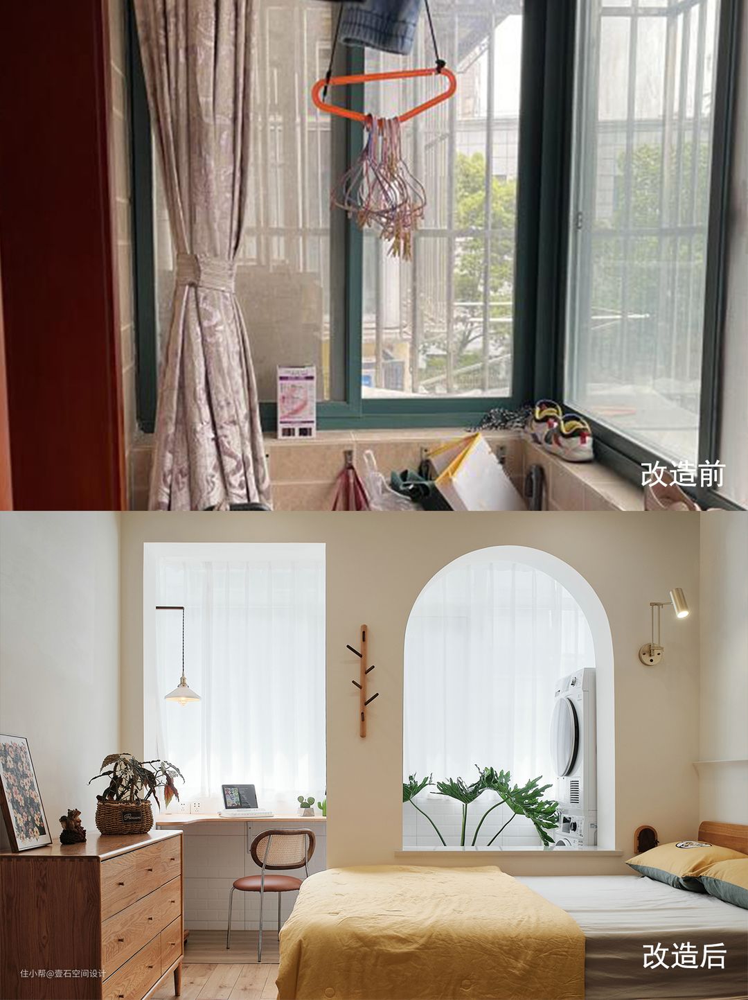 洗衣机烘干机放置阳台一角,平时衣服烘干以后就可以直接扔在床上整理好叠放起来,不占用其他位置。