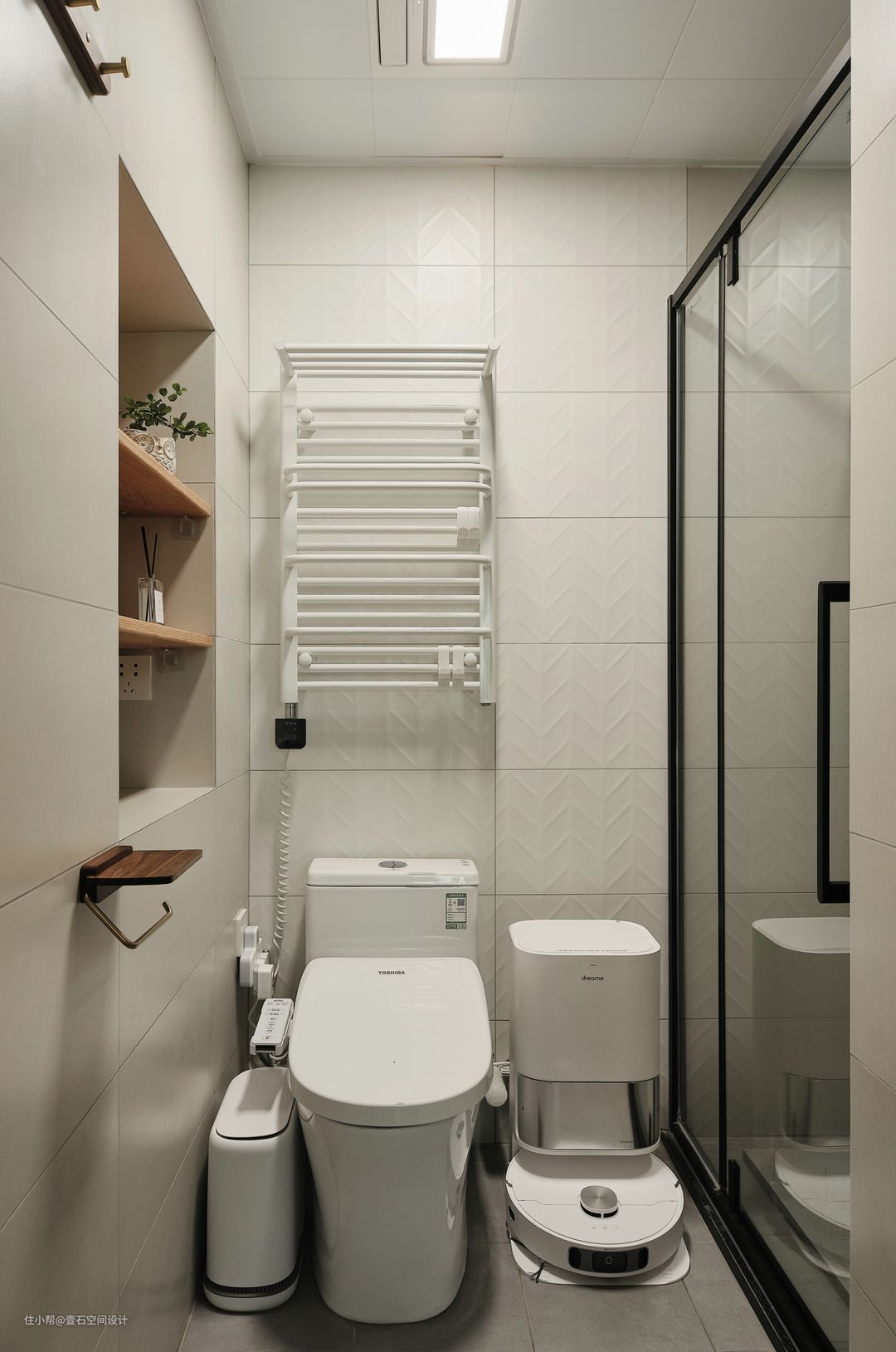 卫生间内部除了马桶区和淋浴房,还设计了壁龛储物空间,挂钩和电热衣架让小空间更舒适。