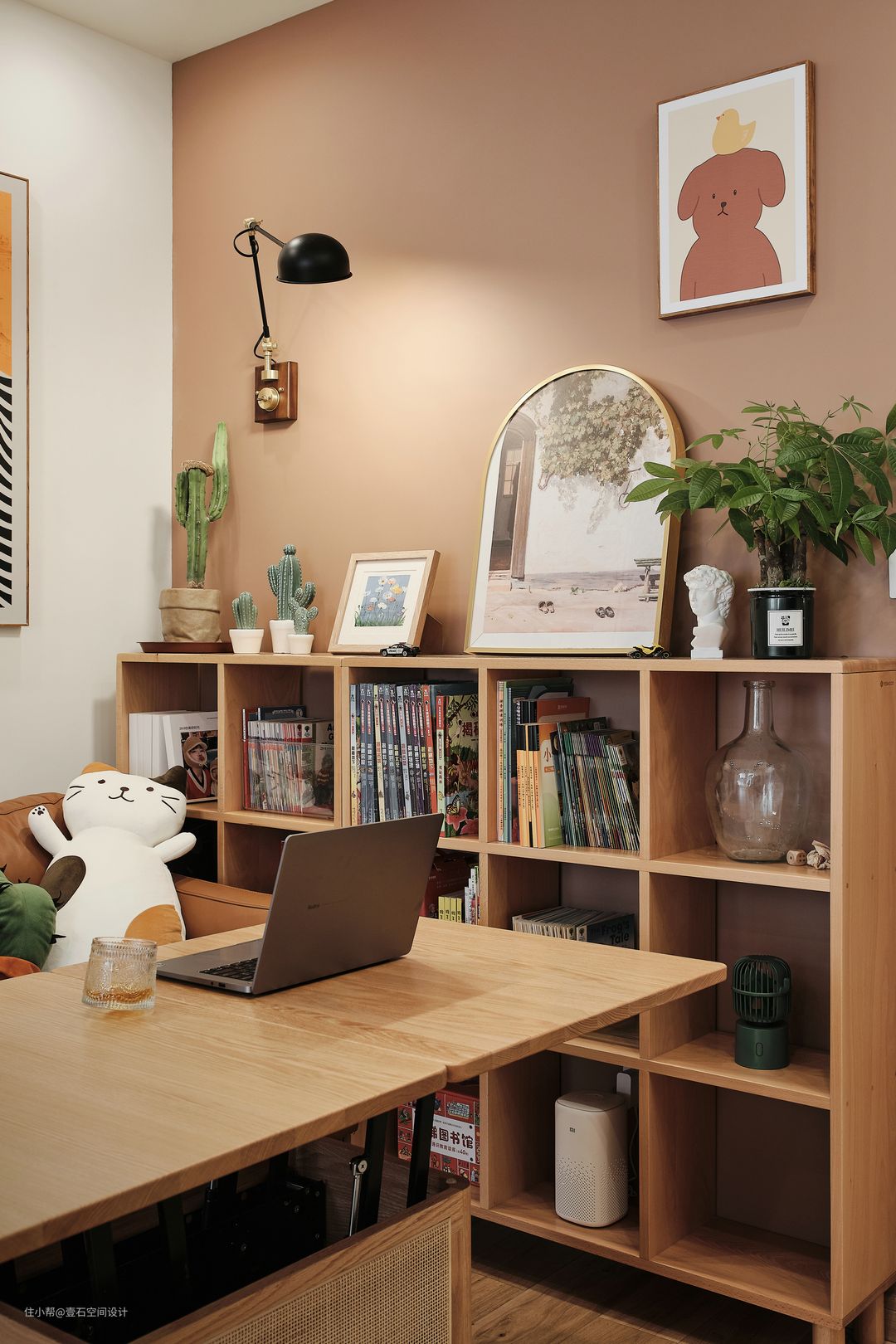 家里的客厅也可以作为书房,靠墙一组书柜,摆放大人小孩的书籍,也可以摆放一些小饰品和绿植点缀,满满的温度。