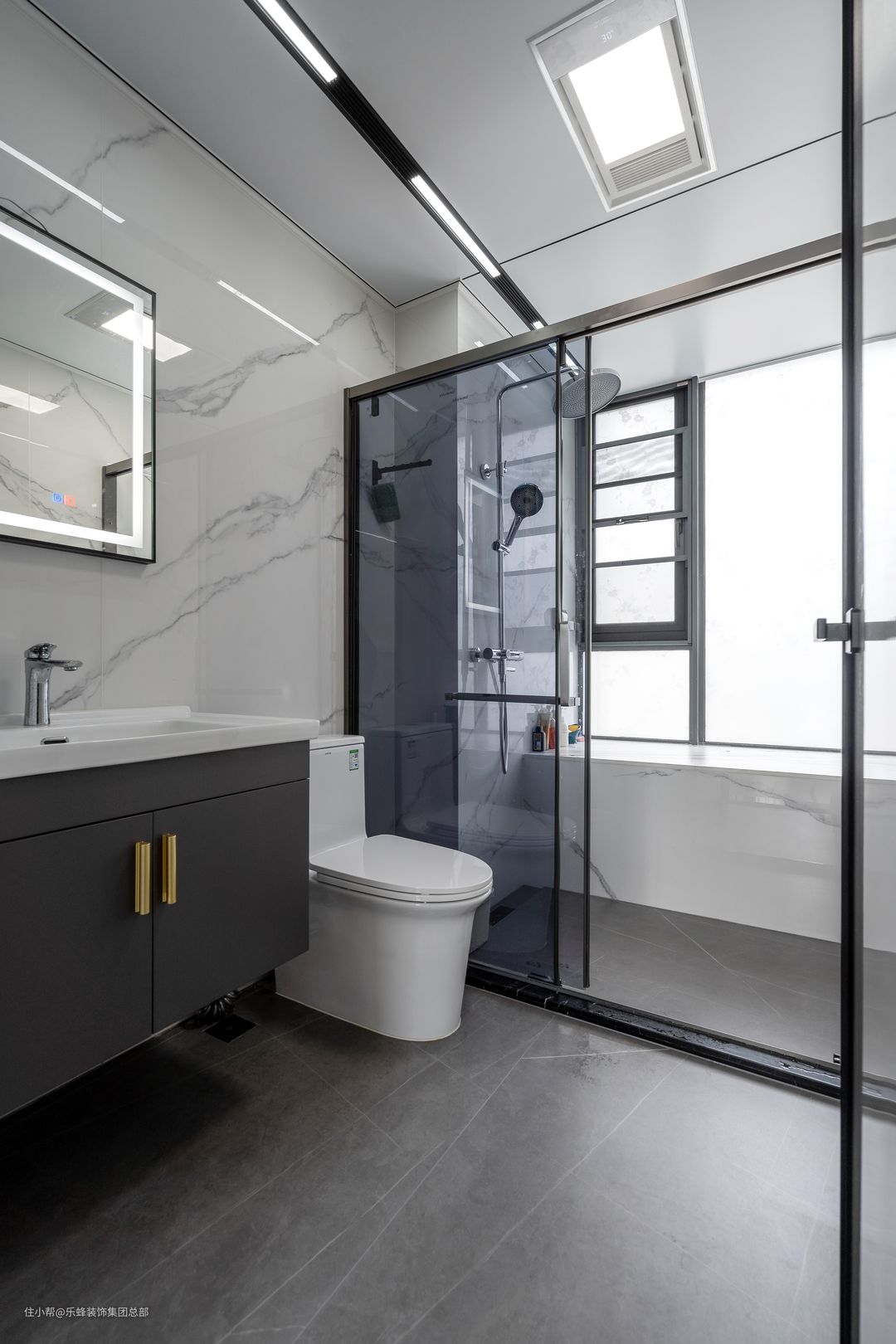 干湿分离设计,卫生间也采取了大砖通铺,十分大气舒适。玻璃推拉门阻挡水汽,减少卫生间清洁压力。
