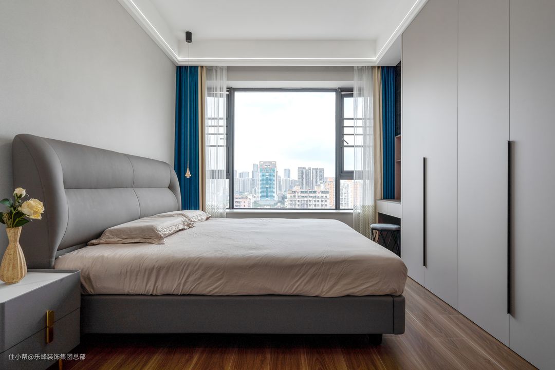 以简约为主的主卧设计,色彩以素净为主,选择了饱和度低的浅灰和米色,整个空间看起来温柔娴静。主卧优秀的视野也在无形之中增加了主卧开阔的空间感。