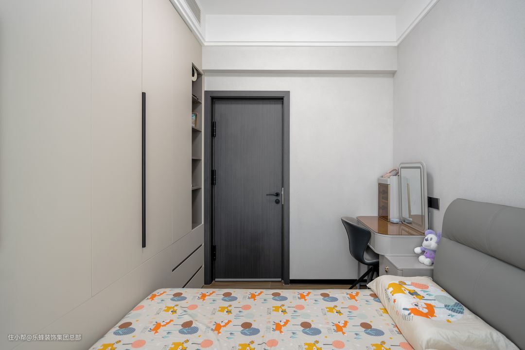 女孩房对收纳有很高需求,所以靠墙设计了一整面收纳柜,方便收纳孩子的衣物和杂物。处于更高的舒适度考虑,没有选择榻榻米设计,而是选择了尺寸合适的成品床,达到了榻榻米的效果,孩子日常生活起居也更加舒适。