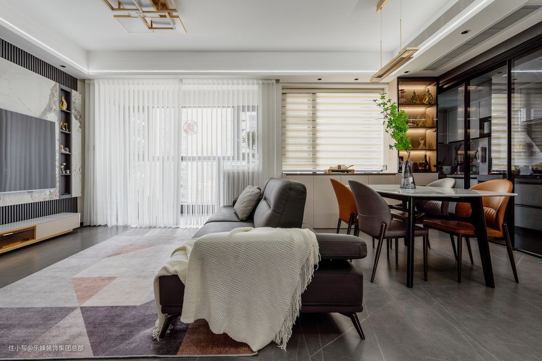 横厅就是优势,为了把横厅的优势发挥到最大,客餐厅之间没有设计隔断,视野和光线都得到了极致的拓展。客厅选择了梦幻帘,可以做到透光不透物,窗帘能够随意调整角度,这样一天之中,不管什么时候阳光都能穿过窗帘洒落进来。