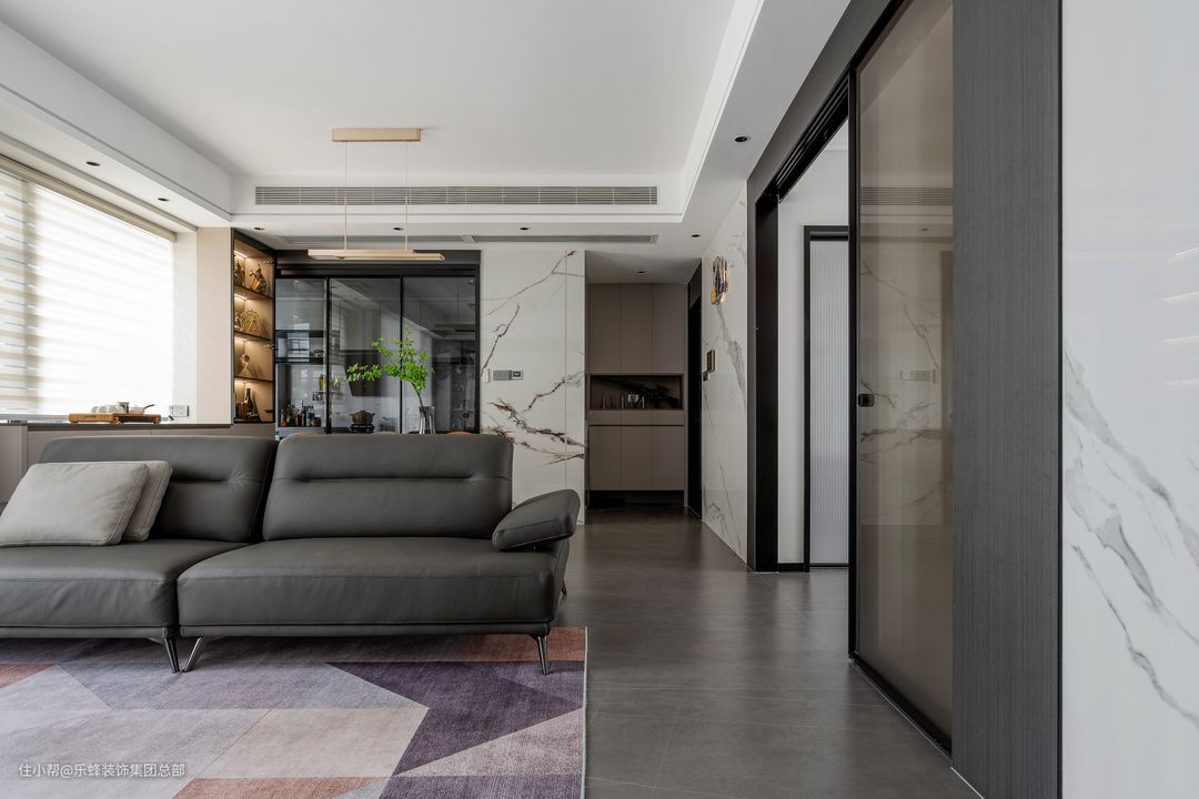 虽然是主灯设计,但并没有造成客厅的压抑,也没有压低层高,造型简约耐看,和顶面四周的灯带、射灯结合照明,公共区域的灯光均匀柔和,也没有丢失层次感。