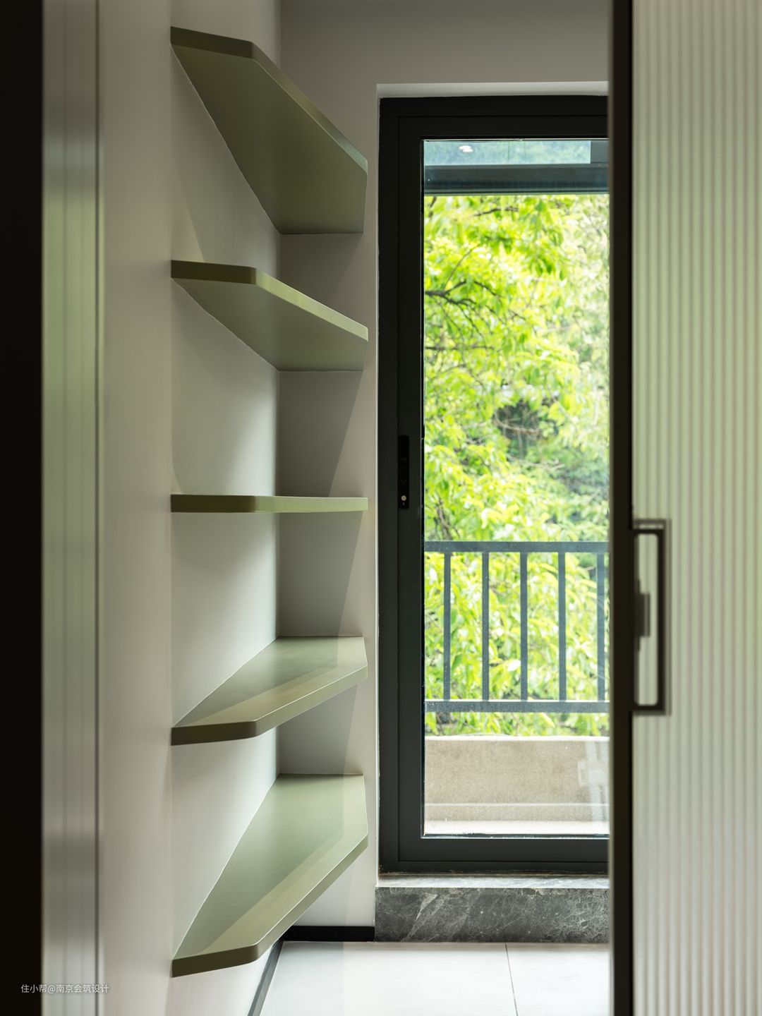 次卧室是正在念小学的儿子的房间,现场制作的书架兼玩具置物架,置物架全部做钝角处理,内宽外窄,线条流畅,中间留出过道可以通过推拉门去往北阳台。