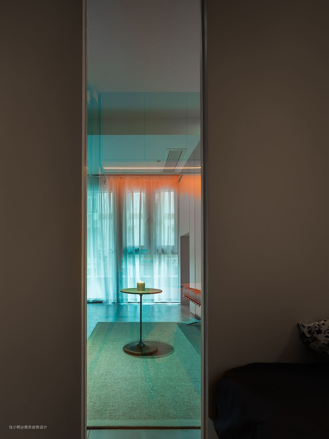 亲子活动区隔出女儿的房间,利用炫彩玻璃既可以辅助采光,又能作为空间的装饰,当卧室门帘拉上后,通透的玻璃材质方便父母随时照看。