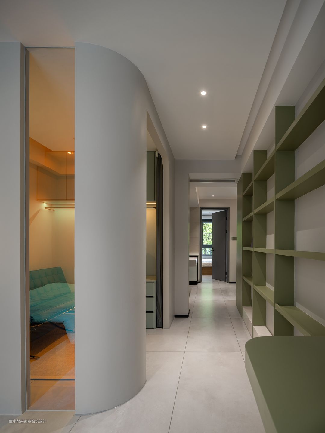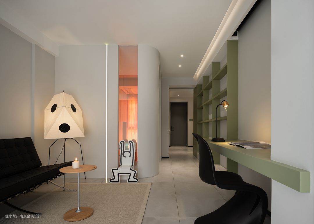 面积较大的主卧改为亲子休闲区之后,隔出一块区域作为女儿房,满足三房需求。墙角做了圆弧钝化处理,不仅可以让孩子在家里跑动更加安全,同时曲面的线条让视线更加流畅,减少视线遮挡。