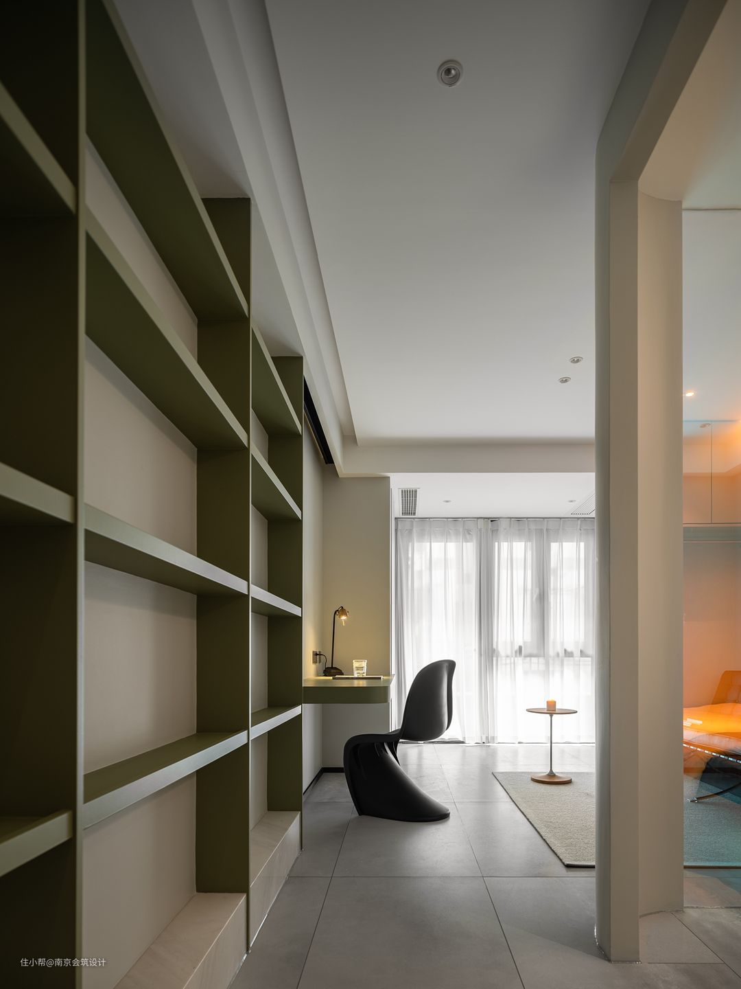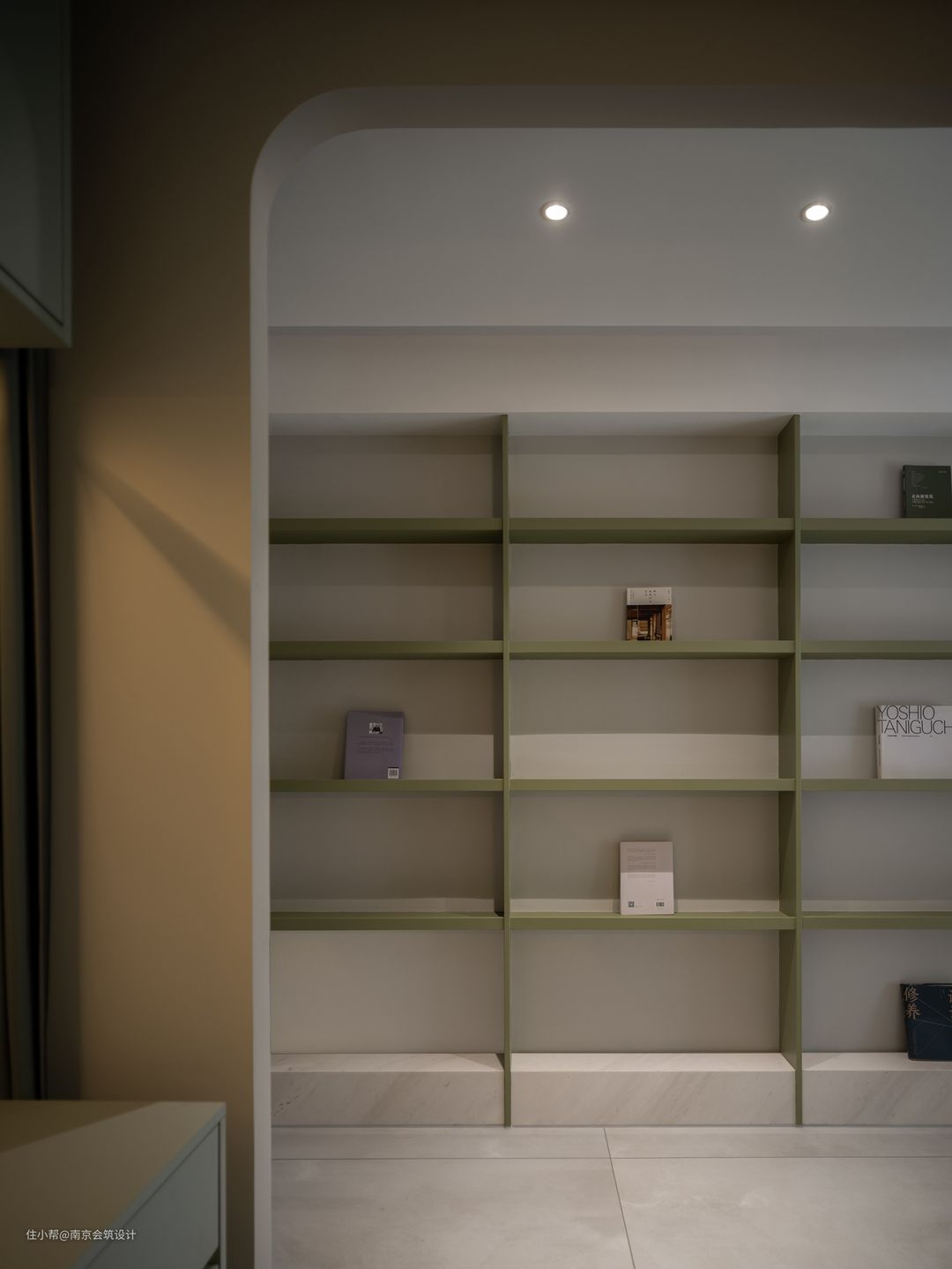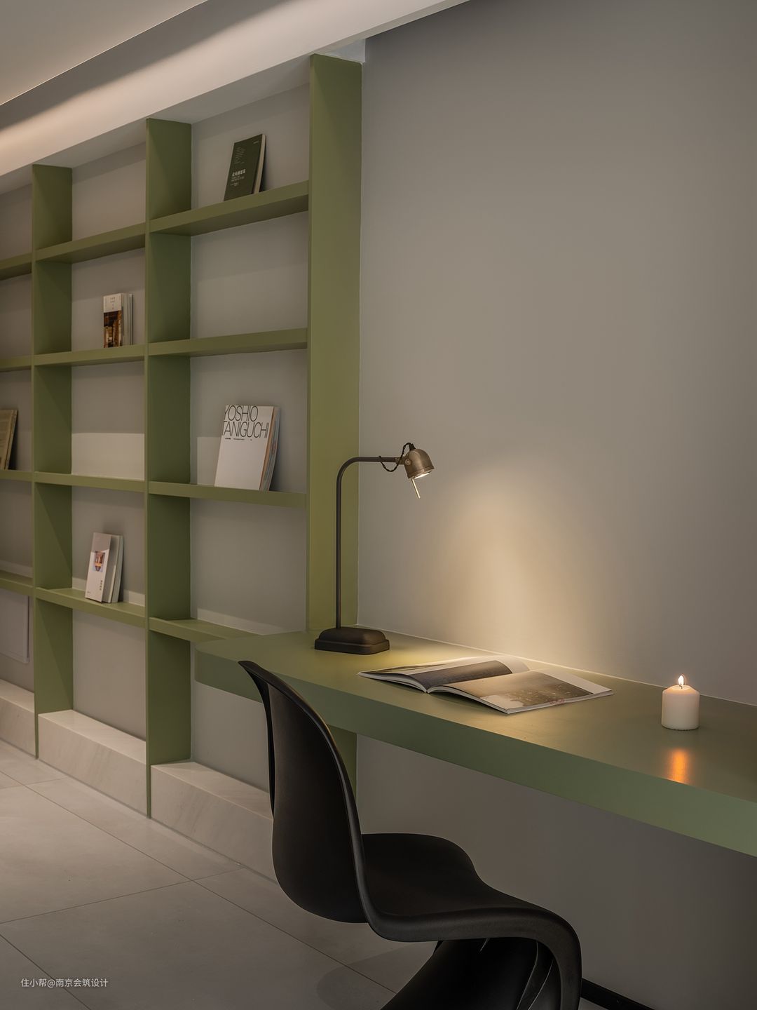 亲子区的走廊连接书桌和整面展示书架,书架与书桌、餐边柜采用统一的兰苕绿,书架外侧设计浅口挡板,书籍可以悉数展示,增加了孩子的阅读兴趣。