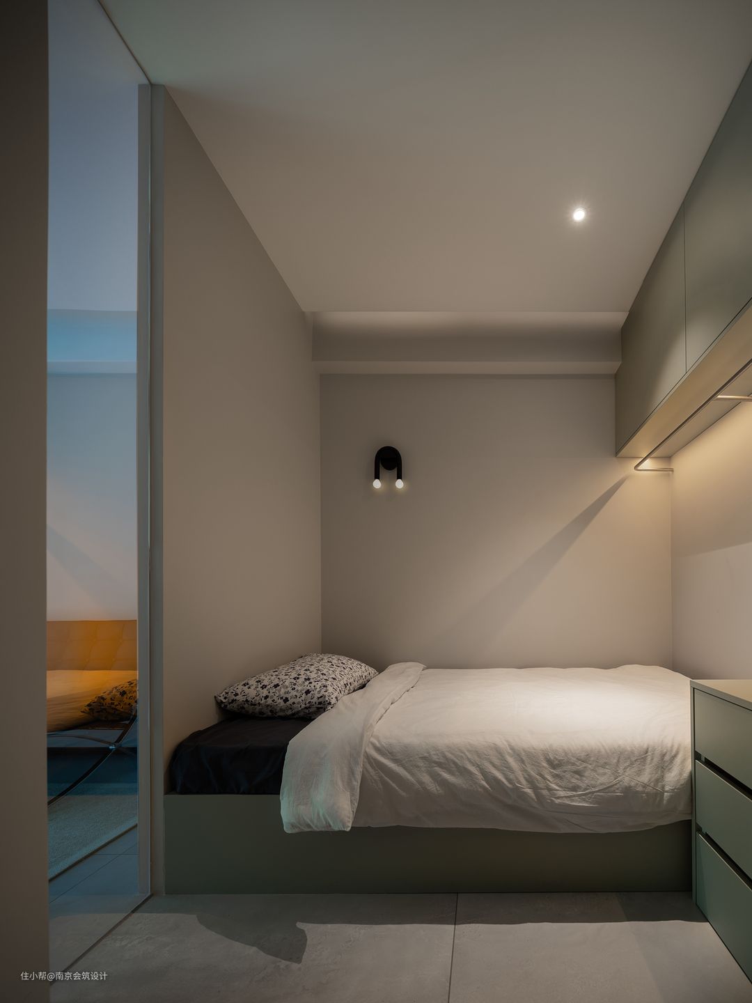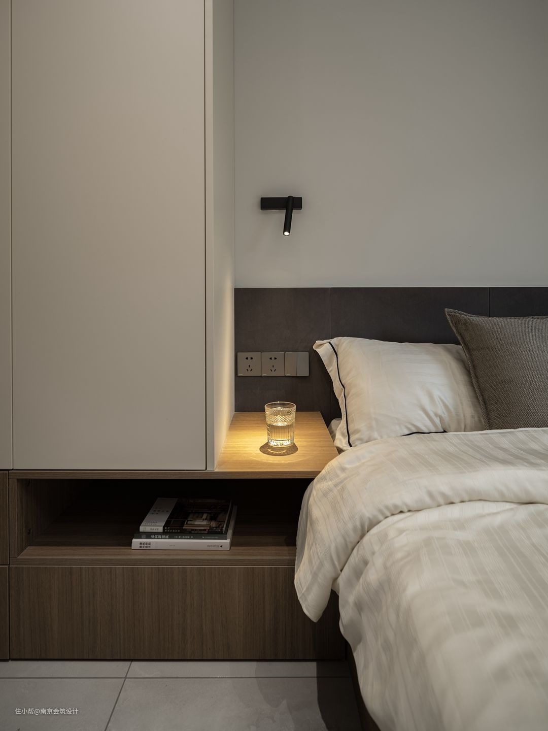 主卧室衣柜采用现场打制,衣柜上下分体,上柜为衣柜,收纳家人的衣物。下边定制柜龛和落地抽屉,方便收纳小件衣物和临时置物,下柜突出衣柜一段刚好用作床头柜置物,想法精致巧妙,可以说将方寸之地的作用发挥的淋漓尽致。