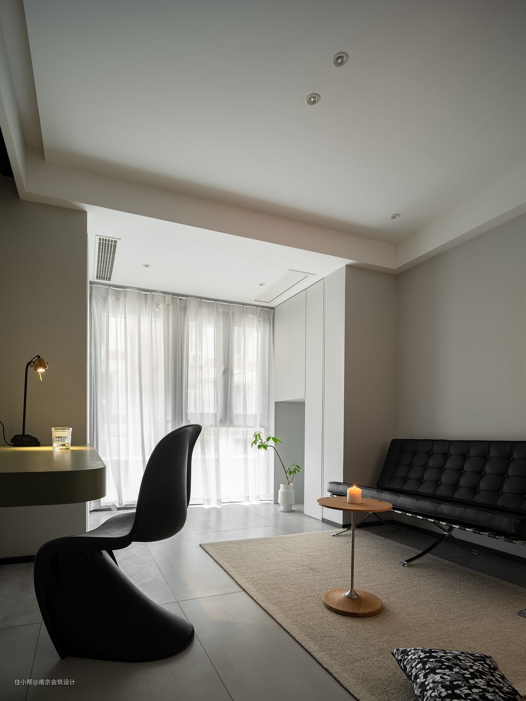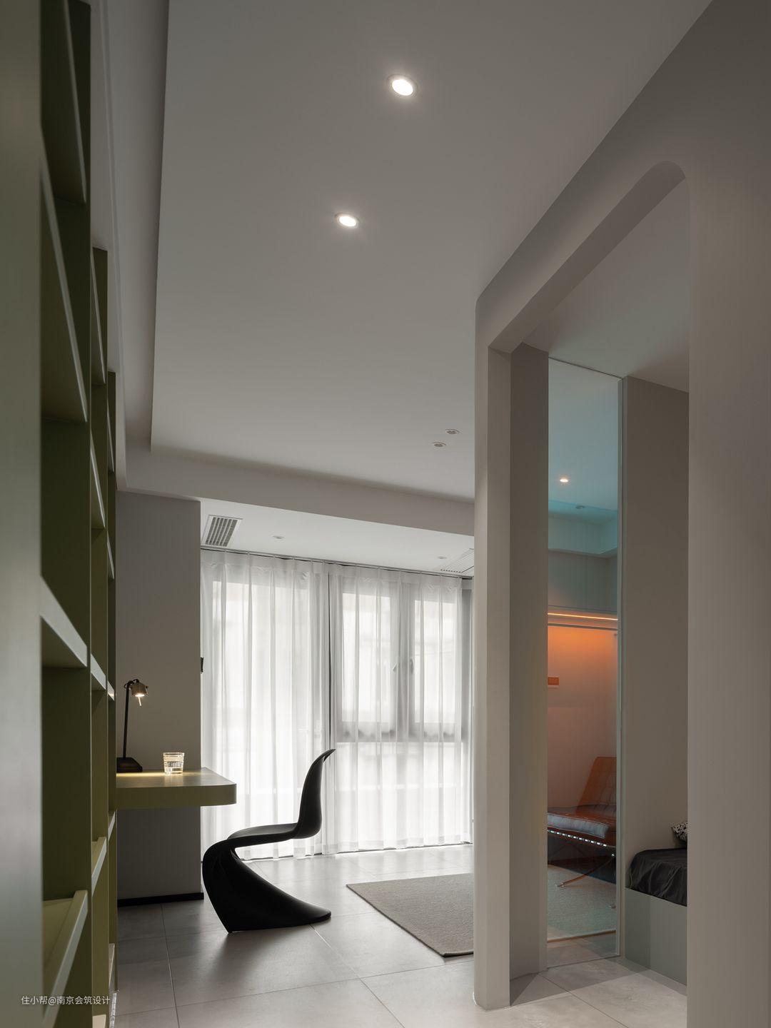 原先唯一朝南、采光最好、面积最大的主卧室改为亲子休闲区,阳台打通改为入户门厅。入户门采用玻璃门加平开窗的设计,半透明的白色纱帘既保护一楼隐私也不影响室内的采光。