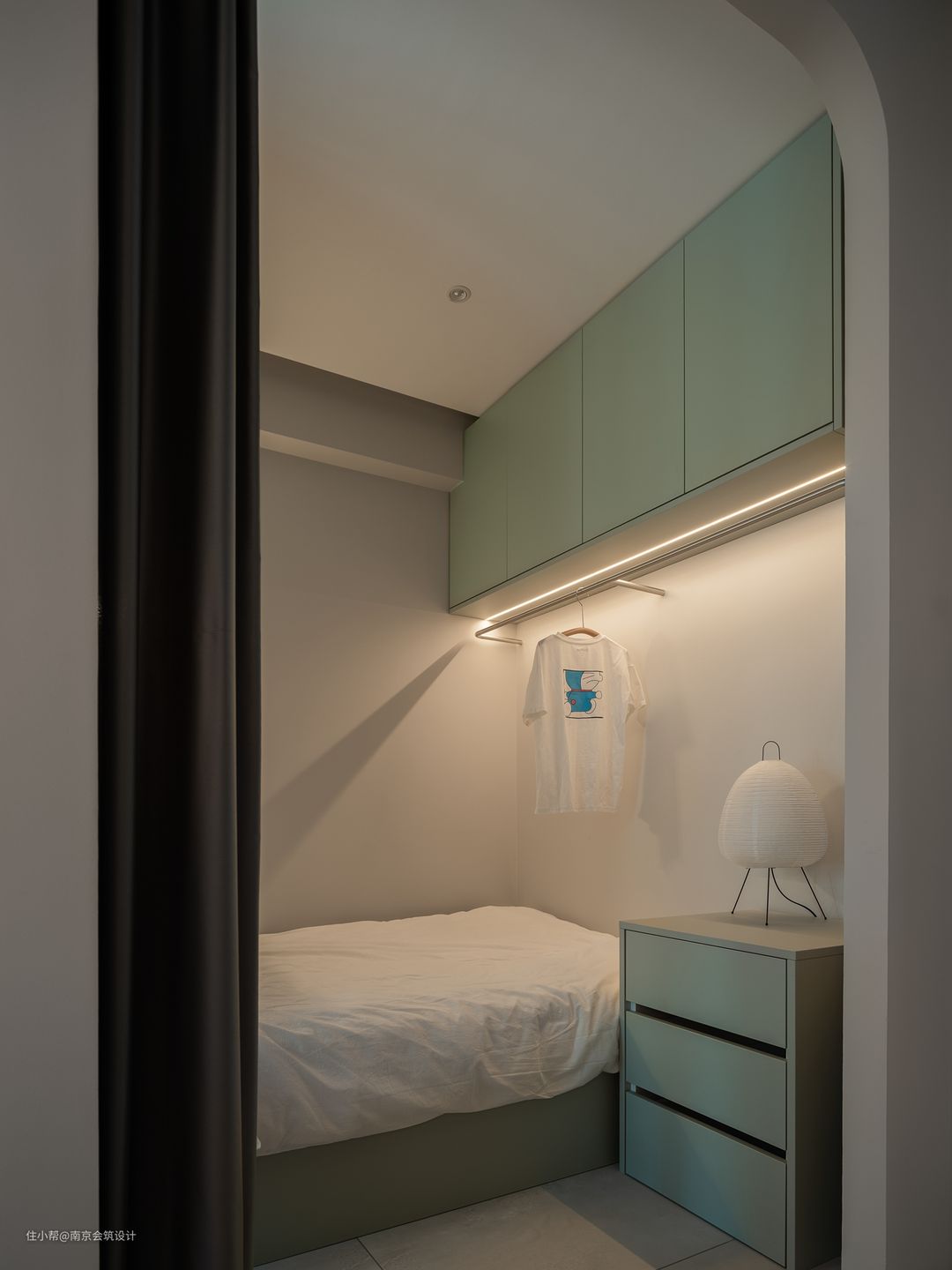 床尾打制吊柜和床边柜,有限空间里最大化地增强收纳功能,吊柜可以收纳宝宝不常用的换季衣物,床边柜则用来收纳小件衣物。