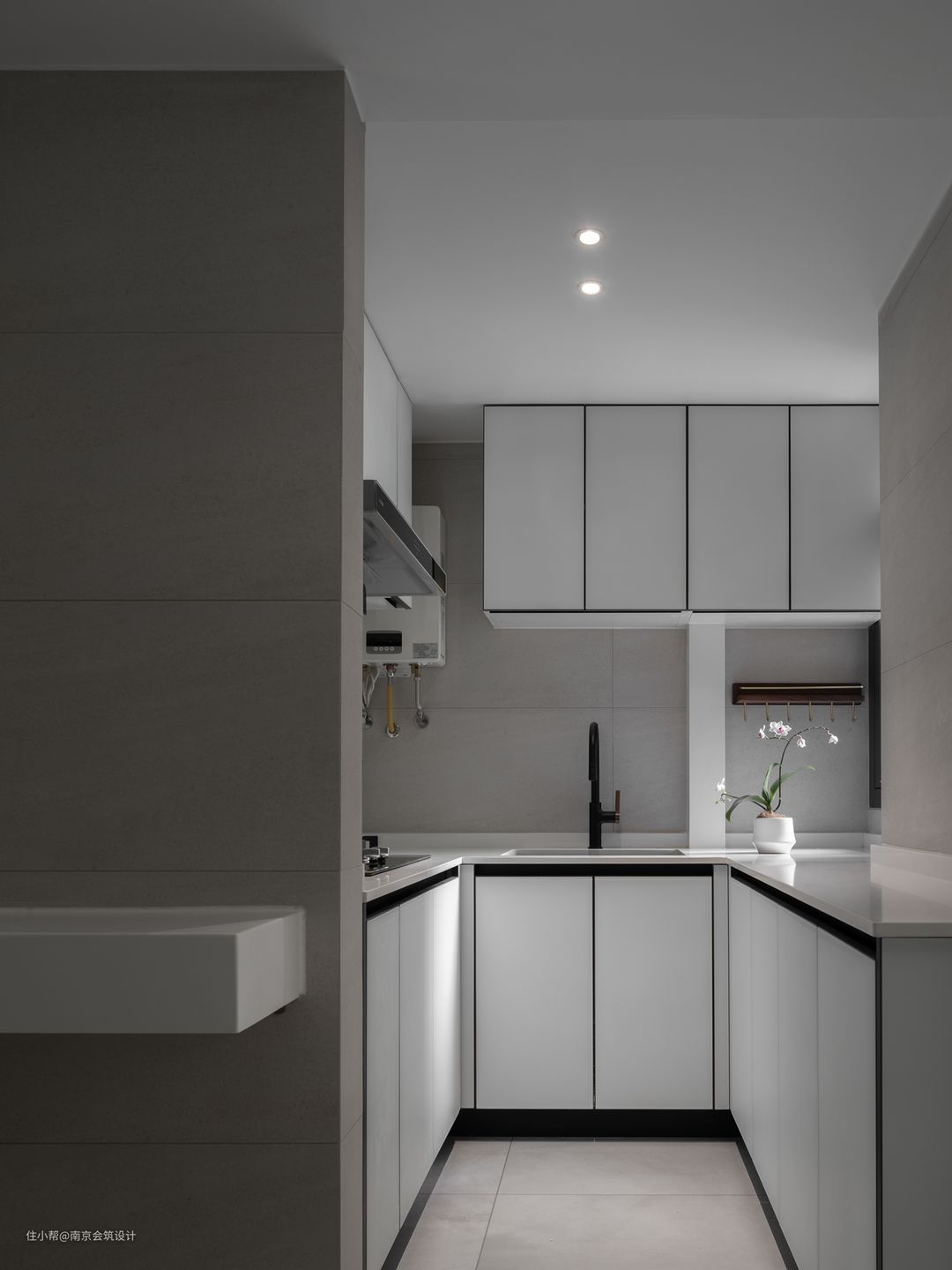 冰箱外置内嵌于餐边柜,厨房U型橱柜设计,操作台面和储物空间得以扩展。开放式的厨房设计,采光和通风均得以最大化释放和改善。