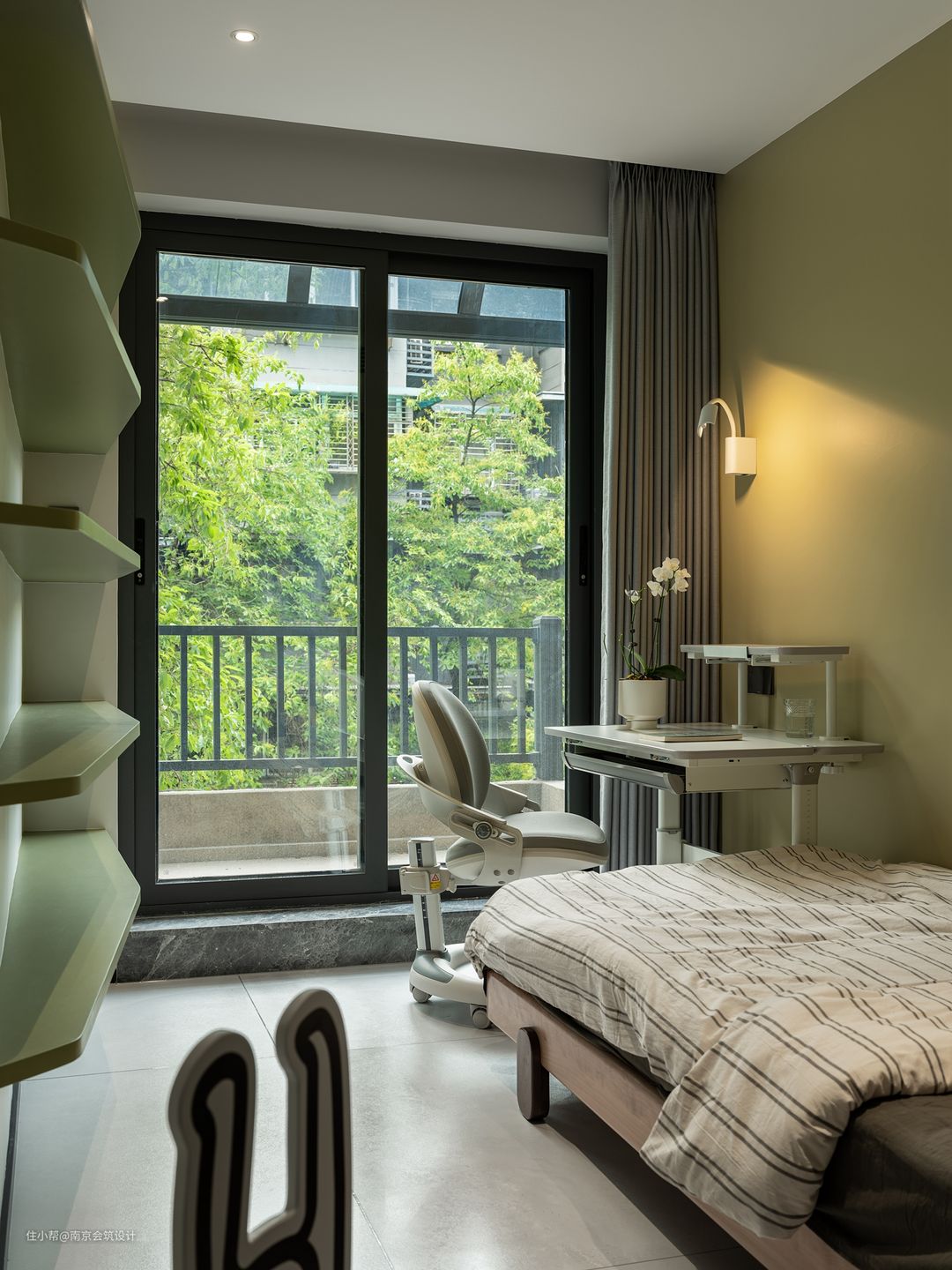 男孩房没有多余的装饰,保留单人卡通床和书桌,可以升降的桌椅可以满足孩子不同年龄阶段的需要,推拉门外可以进出户外,营造了一个轻松自由、充满童真的独立环境。