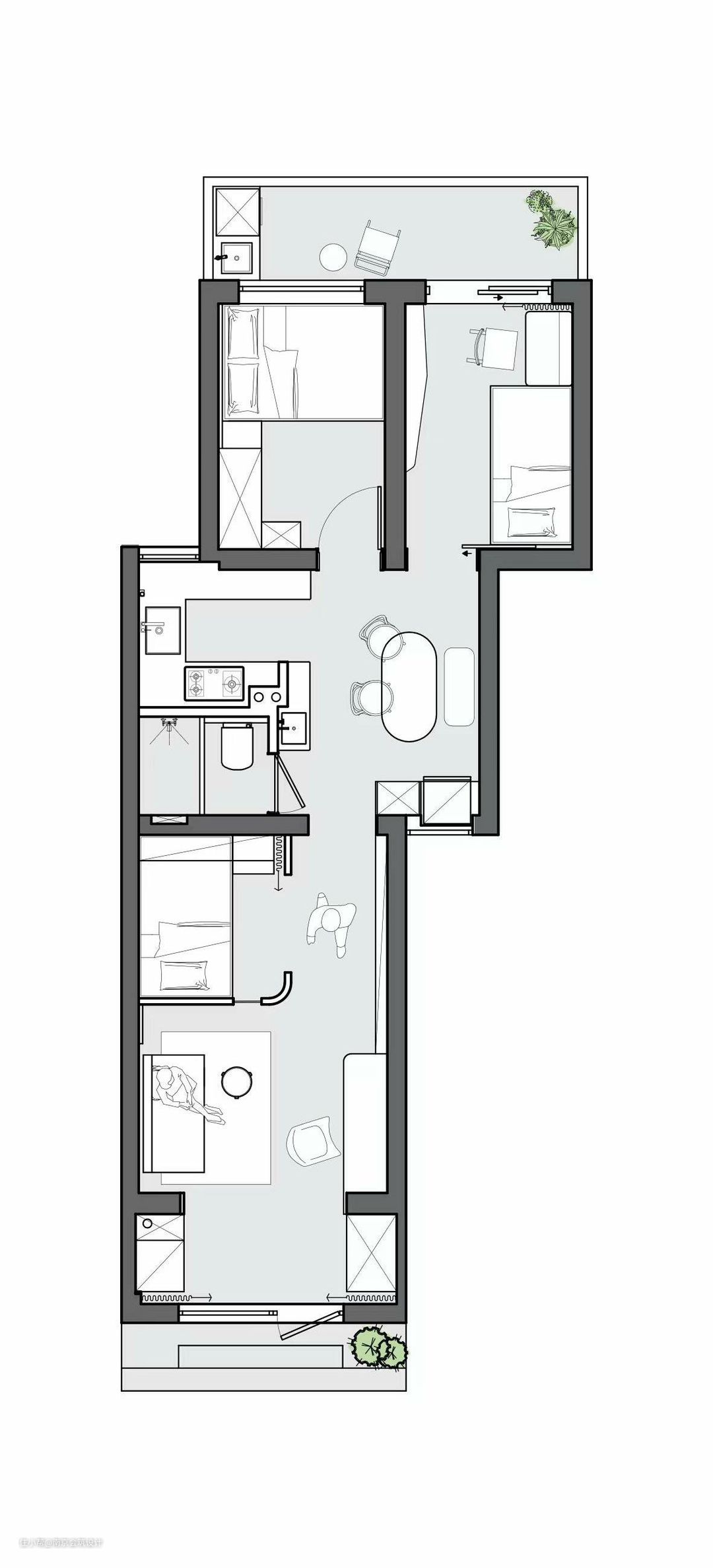 数一数,这已经是贾先生委托设计的第三套房啦!第一套婚房,第二套改善型住房,第三套便是这一套“老破小”学区房改造,原始建筑面积约60平,因为位于一楼又是砖混结构,内部基本都是不可拆改的红砖墙体,但业主一家四口居住,两个孩子都为学龄儿童,需要有各自独立的睡眠和学习空间,所以必须满足三房的居住需求。