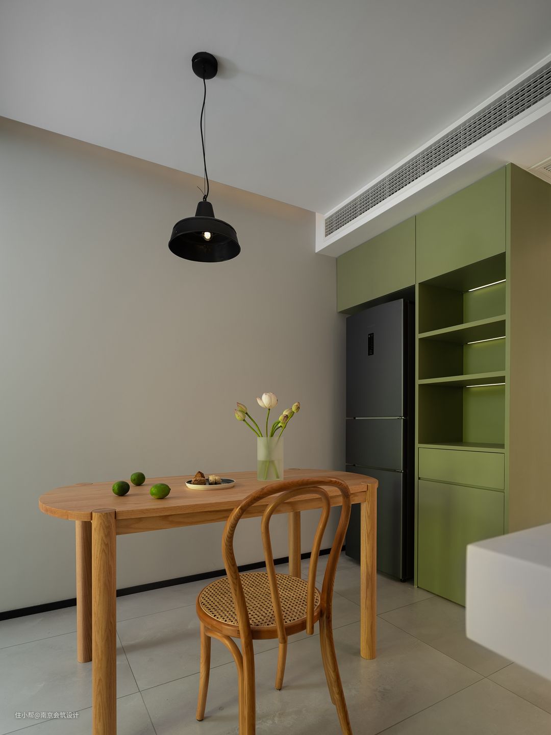 入户门封堵后定制一组餐边柜,延伸了亲子区书架和书桌的兰苕绿,保持空间的整体性。餐边柜既有开放展架,也设计了抽屉和封闭地柜,轻松收纳各类餐厨用品和小家电等,提升家人的生活水平。