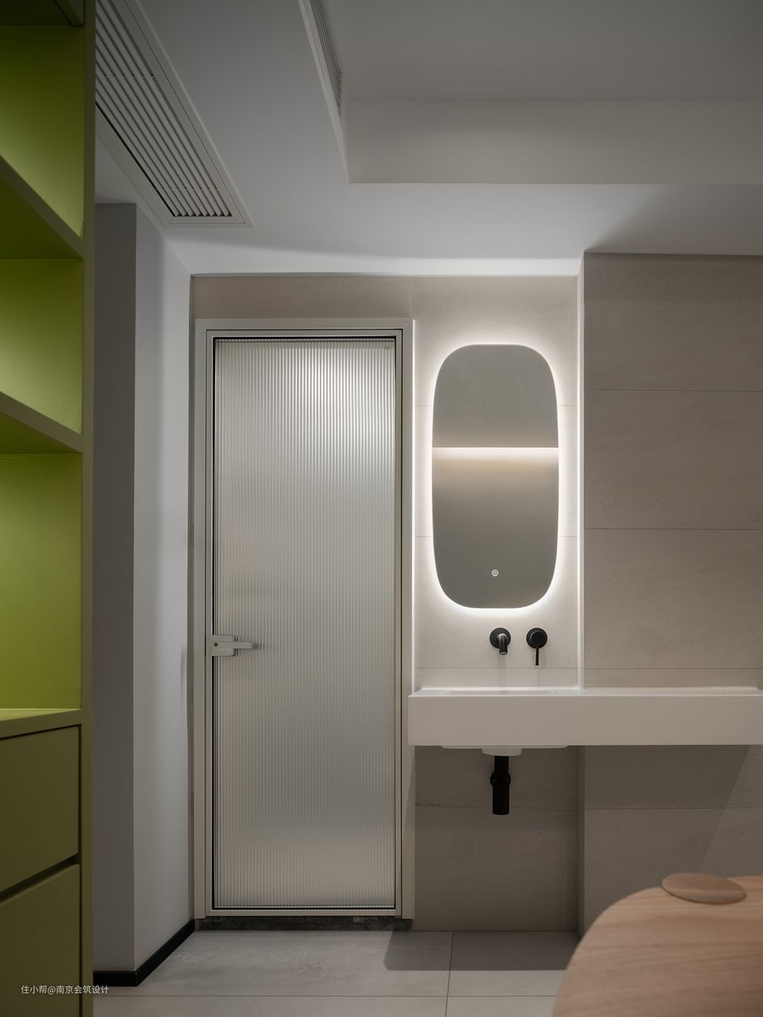 唯一可以调整的非承重墙体是厨卫共墙,设计师将墙体内退,台盆外置实现卫生间的干湿分离,使用更加方便。卫生间门选择了窄边长虹玻璃门,采光得以改善。