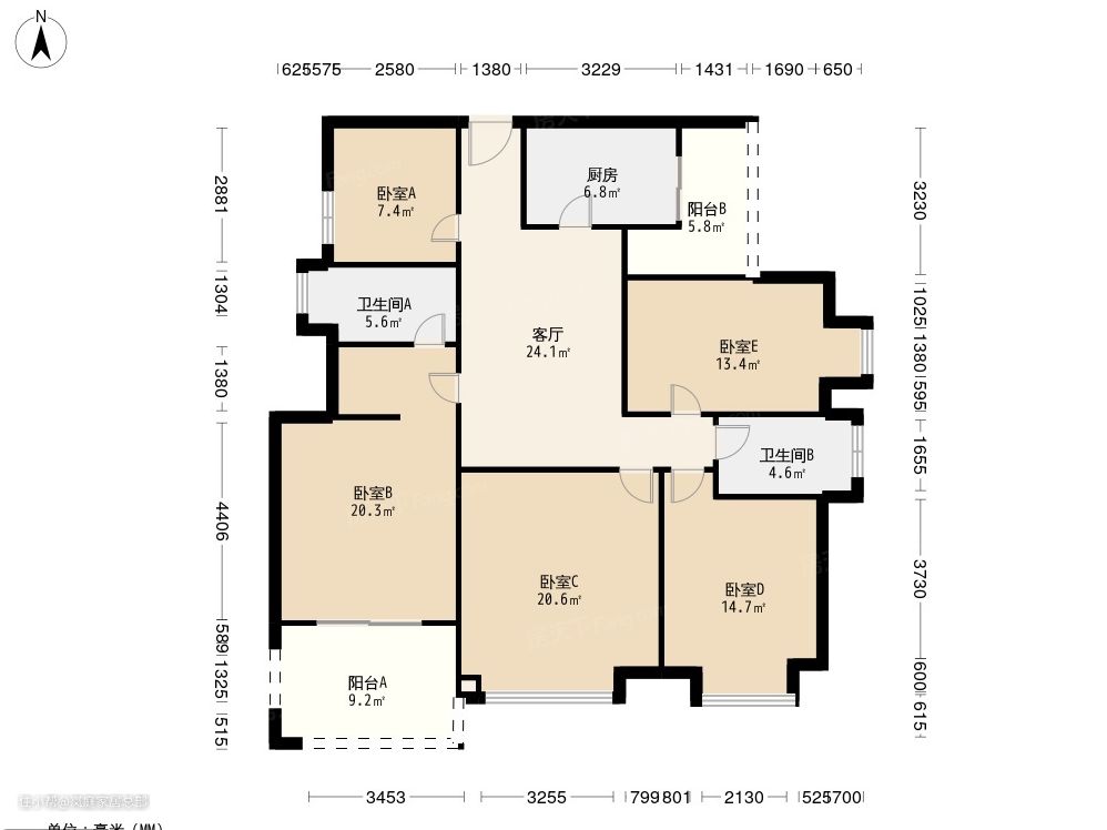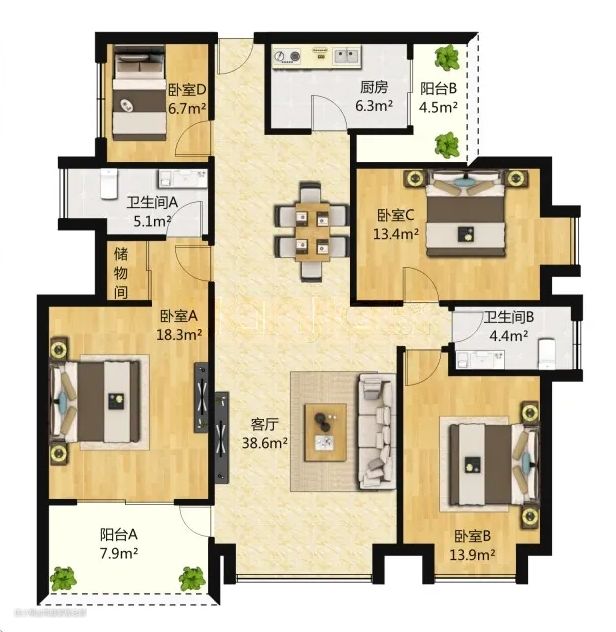 这是原始户型图,整体布局来说,还是布局还是比较方正的,不用做大的拆改。但是卧室C会影响客厅的采光,将卧室的非承重墙体拆除,让客餐厅的动线更宽敞的同时采光也会更通透。