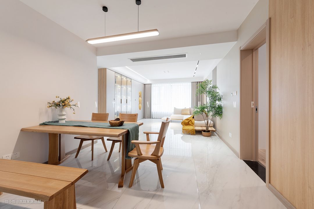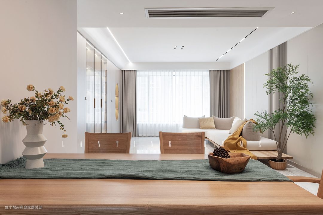 设计师:杨鑫 楼盘:人居东苑E区 面积:154㎡ 风格:简约原木风 本案是以原木元素为主的,大面积的白色配色加入原本元素,能调和空间气质。设计师杨鑫从材质和布局出发,保证空间的动静分区和居住舒适度。本案是一家三口居住,他们需要的是一个极简的,动线流畅的家,考虑到孩子还小,对于客厅的设计是比较实用的,舍弃了电视背景墙,做成了整面墙的储物柜,是时下流行的去客厅化设计。