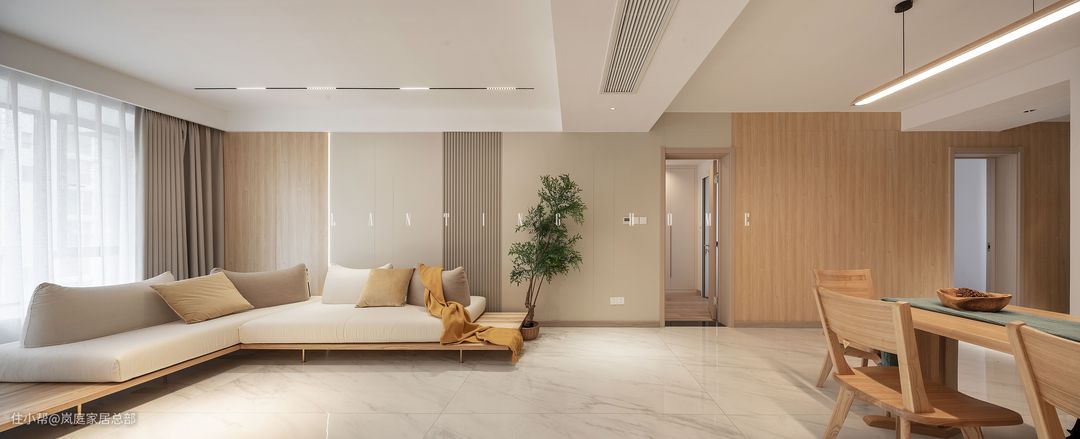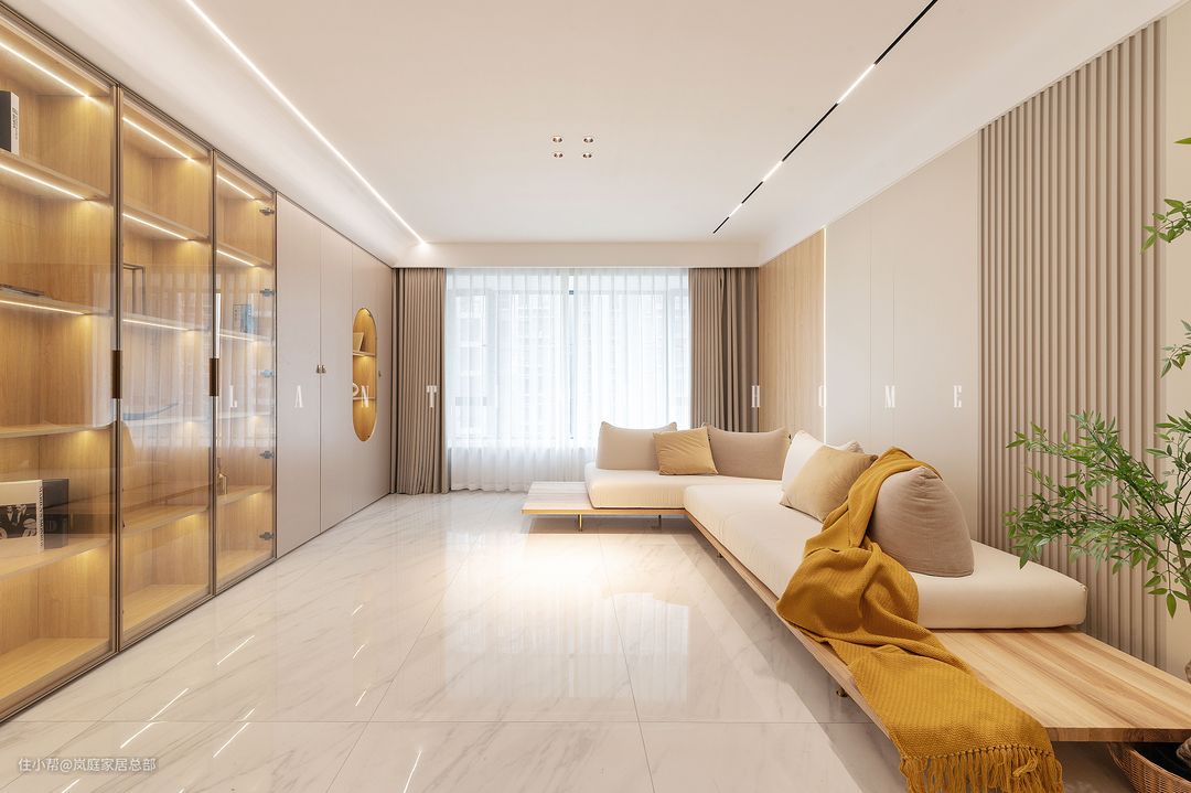 客厅选择无主灯设计,磁吸轨道灯搭配筒灯,看似朴实无华的设计,却能轻松拿捏空间氛围感。在吊顶处增加线性灯,氛围灯的存在刚刚好。整屋从实用性和氛围感出发,大面积留白的客厅设计更有呼吸感。 客厅通铺米色的地砖,简单的纹理让地面摆脱单调,这些精致的细节,让居住空间更有仪式感。