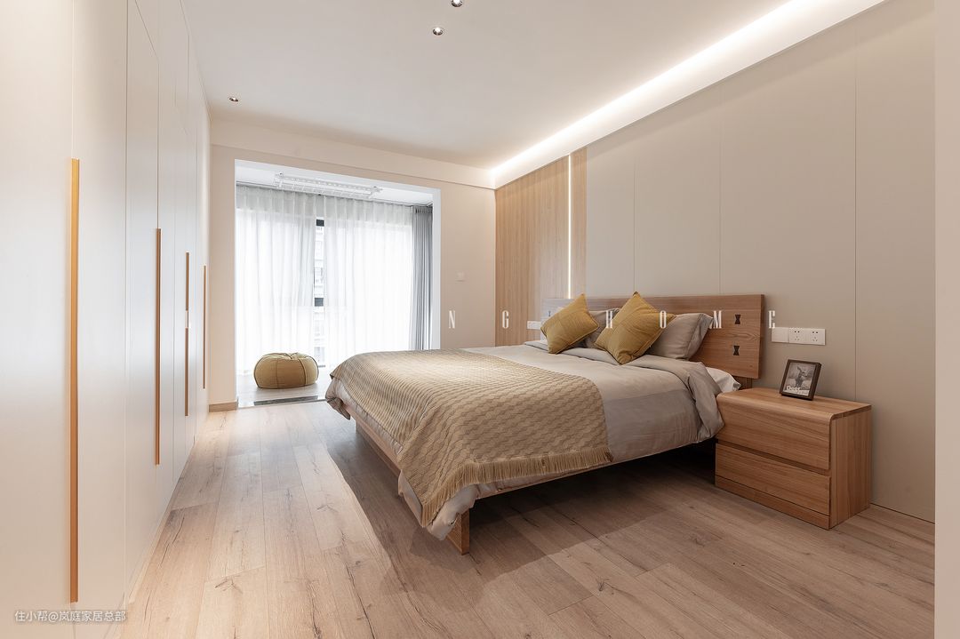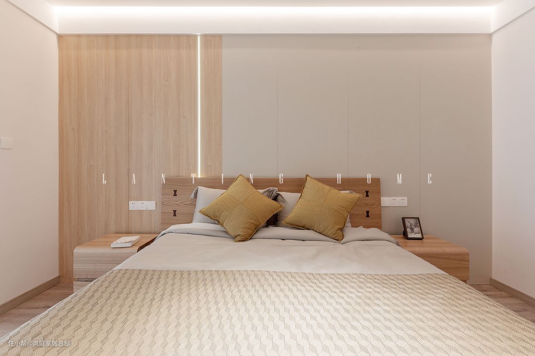 在床头背景墙的设计上,延续沙发背景墙的设计,增加木饰面和护墙板,在背景墙加入线性灯,三种元素的叠加,透露出简约精致的空间感。床头安装了足够的开关插座,方便日常使用,提高居住的便利程度。 在床头两个同款的木质元素床头柜,加入弧形元素,减少锋利的硬朗感。