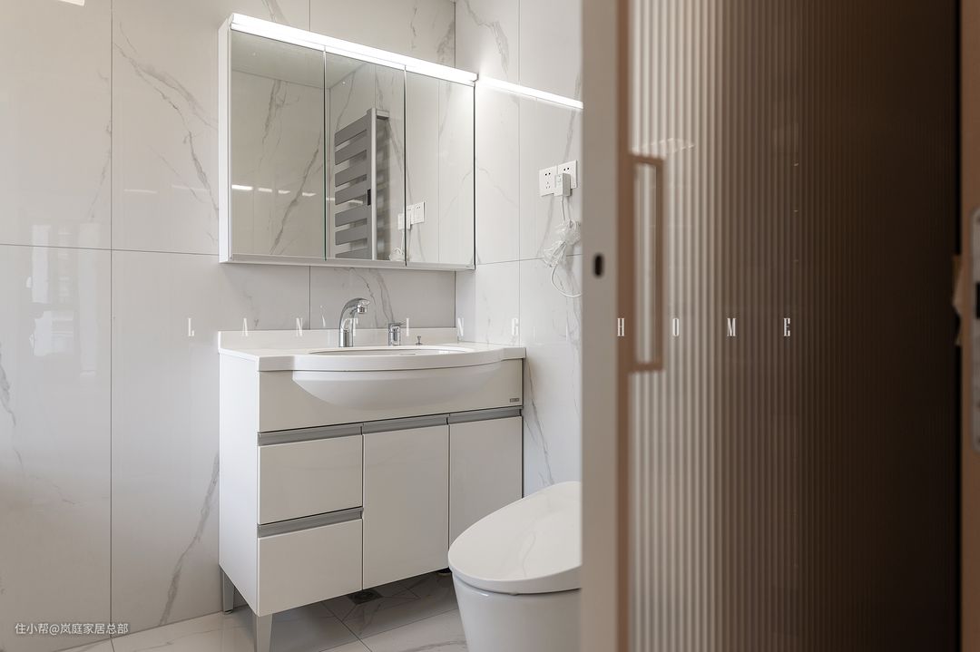 卫生间以白色为主,干会分离设计,在墙砖的选择上,1500*750的大尺寸墙砖不会影响视觉感受,反而能呈现出一种大气的视觉感。 浴室柜选择成品的落地款式,储物型的镜柜,可以放置囤货的商品。在视觉上更显整洁。在镜柜上方增加了灯带设计,可以作为辅助照明,化妆的时候不会被遮挡。