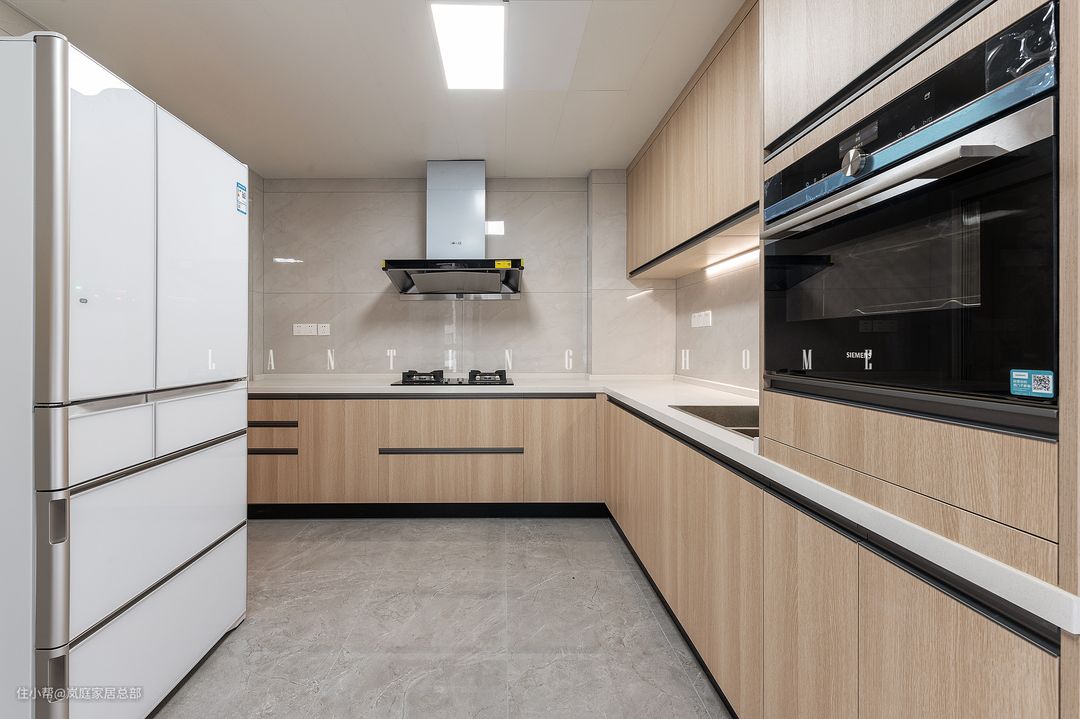 选择米色的石英石材质,耐磨耐高温,是很多家庭的首选,米色和原木色的搭配也不会显得突兀。在橱柜内部嵌入蒸烤一体机,在这些细节处提高居住舒适度。