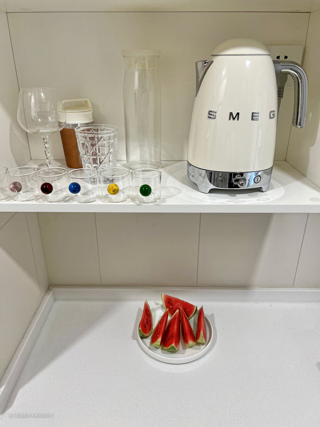#SMEG烧水壶 的颜值我也好喜欢♥️ 又回到讲玄关的时候提到的,进行全案统筹时,就需要确定好电器型号以及计划在哪里使用这个电器,比如现在放烧水壶以及各种水杯的开放格的大小、电位就是提前规划好的。