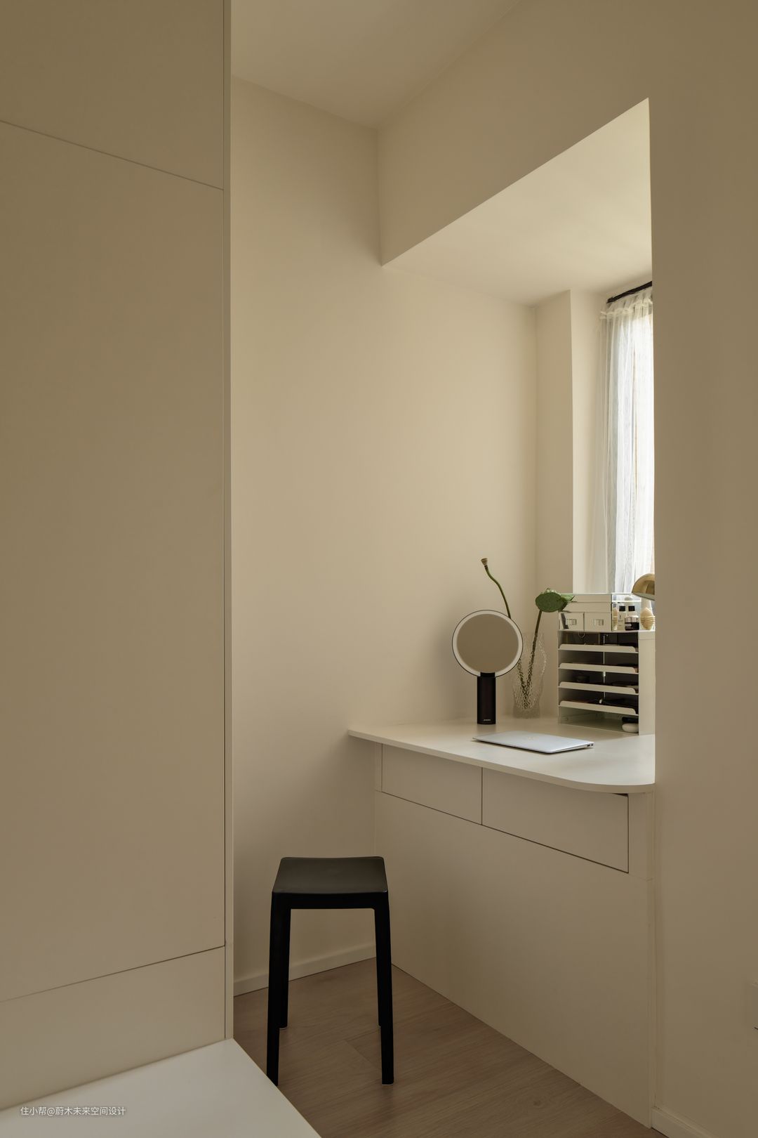 衣帽间原来的飘窗就很小,设计一个双抽屉柜,再加宽桌面,就把这个鸡肋的空间利用起来啦。 Ps: 飘窗和书桌高差做抽屉利用率是最高的; 加宽后的桌面直角边倒圆弧,避免磕碰。