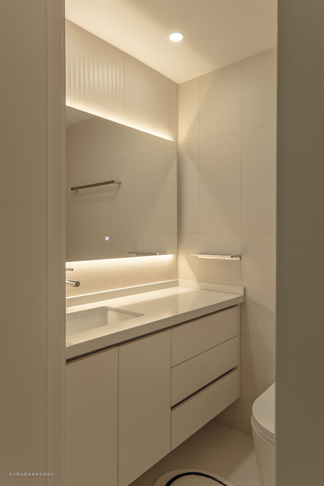 合理的结构改造,真的太重要了; 小户型里,能拥有1.3m长的超大浴室柜算是奇迹! 上下出光的浴室镜,不仅可以起到局部照明作用,还能让打到脸上的光线均匀,偶尔在这里化妆、护肤也没问题。