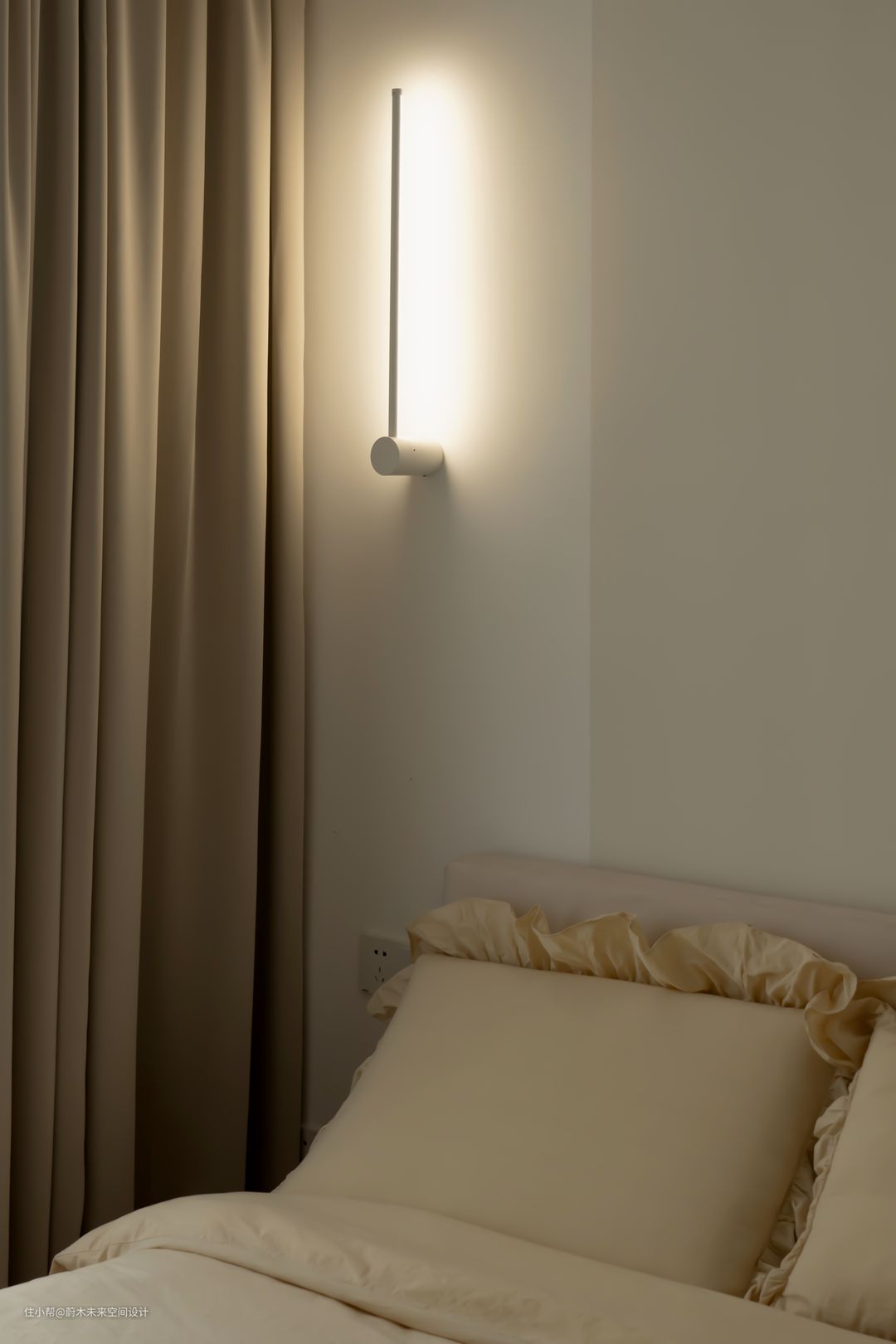 卧室 延续活动空间色调,暖暖的,超温馨! 床头背景利用建筑结构里的墙面高差,做最简单的乳胶漆分色处理,右半部分面积较大的有色漆与右侧衣柜板材保持颜色一致。 (虽然调色的时候需要反复试验,但是呈现出来的效果很值得👍) 左半部分剩余的白色墙面,搭配条形壁灯,想成冲突但又很平衡的美感。