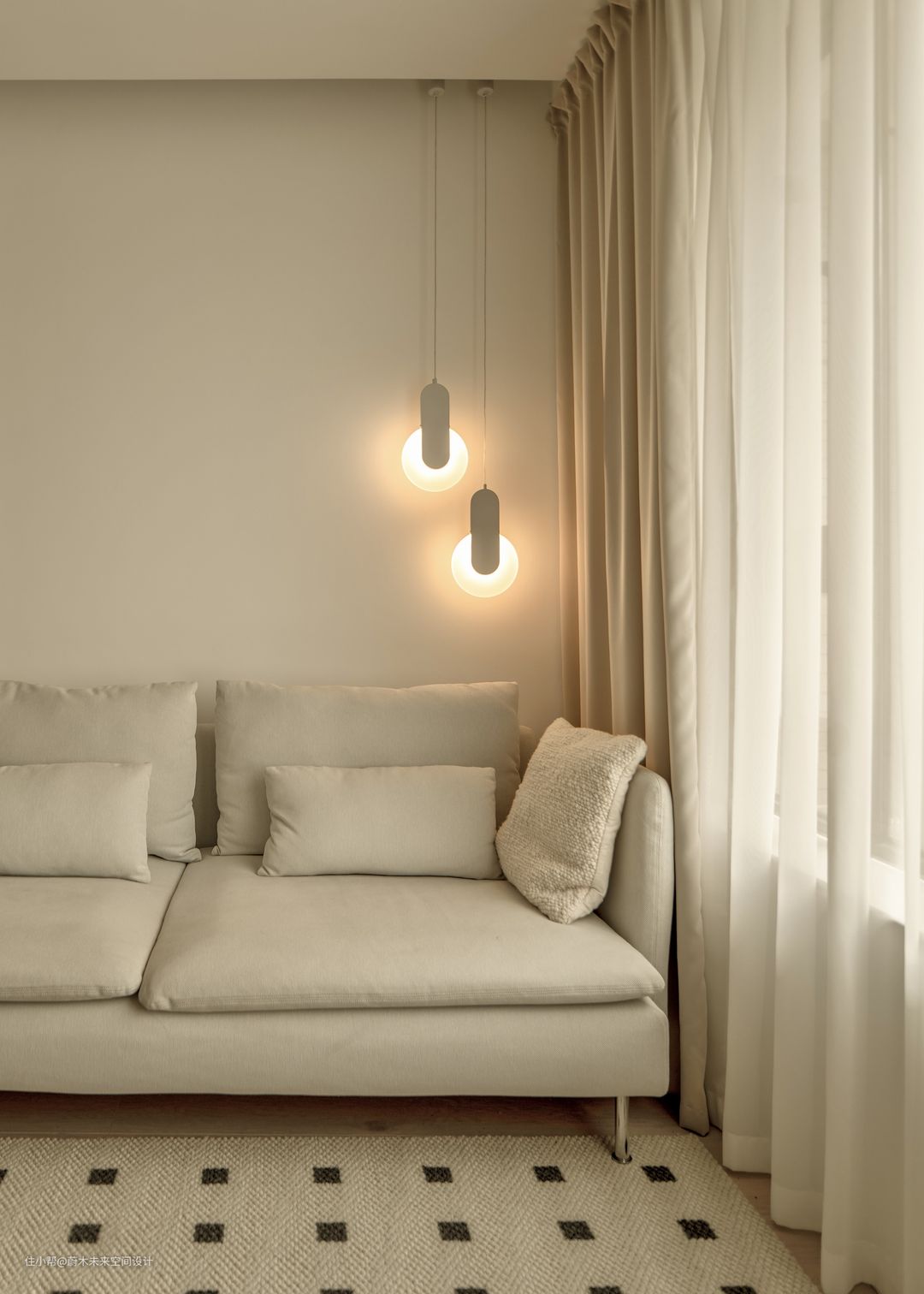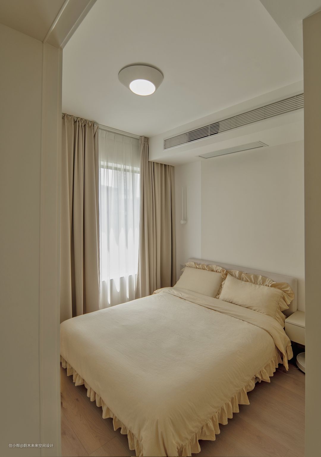 客厅吊顶的形状不对称,是因为安装空调时,物业只允许从窗边将铜管穿墙出去,因此做了两段不同高度的窗帘来实现视觉上的和谐。