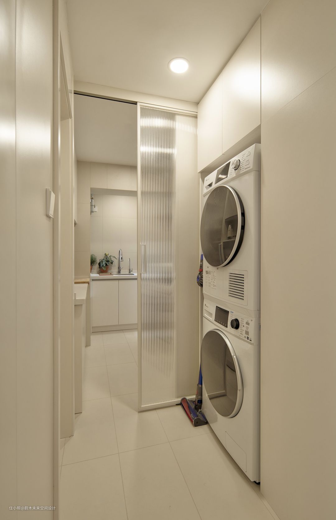 白色洗衣机、烘干机叠放,定制同款茶白色板材吊柜与墙板,用浅色降低小空间带来的压迫感。
