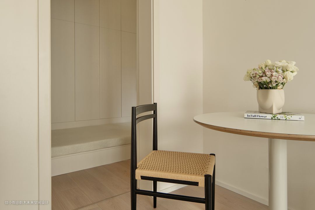 衣帽间藏在餐桌背后,围合式的衣柜+矮地台的组合,保障了储物量,使用起来与方便;偶尔需要用它做客房时,只需要铺上便于收纳的榻榻米床垫就能睡人。