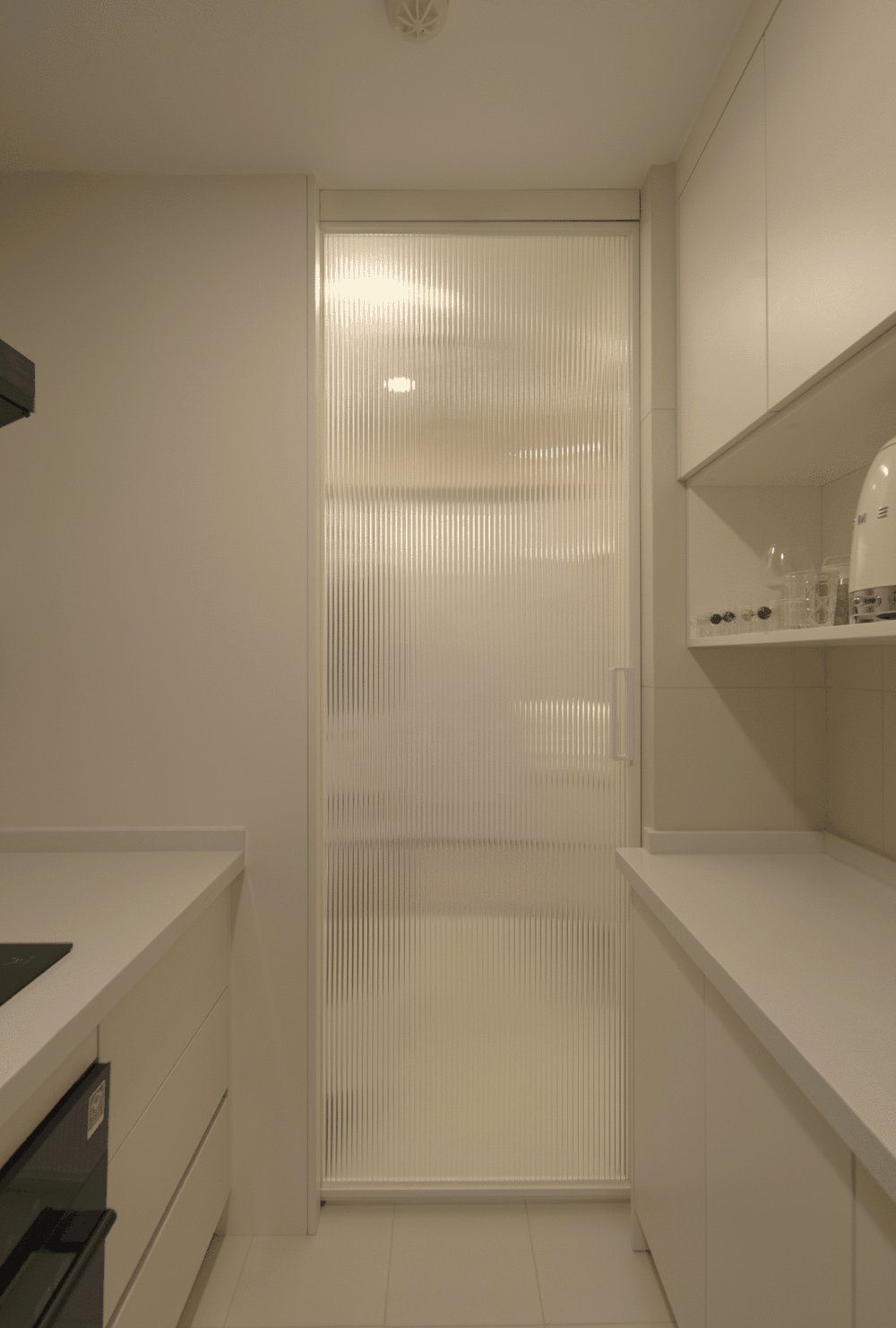 【口袋门】设备间与厨房之间,用一扇「单推拉」「长虹玻璃」「窄框门」做隔离;