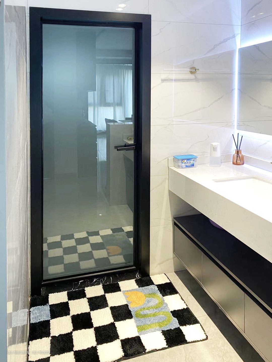 洗手台外置,使卫生间彻底做到了干湿分离。 提升了浴室柜耐用性和使用效率。 半墙设计不仅实现了隔断功能,有效分隔空间,还可作为置物台,放置日常洗漱用品, 或摆放一株绿植,增加空间活力,空气也更清新。
