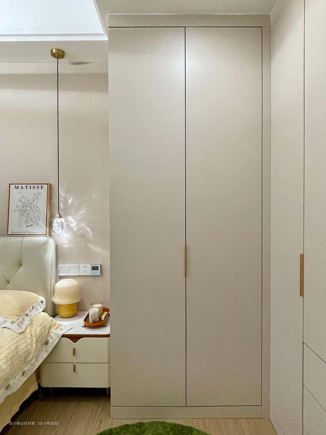 结合原始空间定制了转角衣柜,柜门柜体同色,色号是浅滩可可,淡淡的奶茶色。 除了三个外抽屉,其他都是一门到顶,储物强大,使用方便。 搭配极简金色隐形拉手,简单耐看,实用性强。