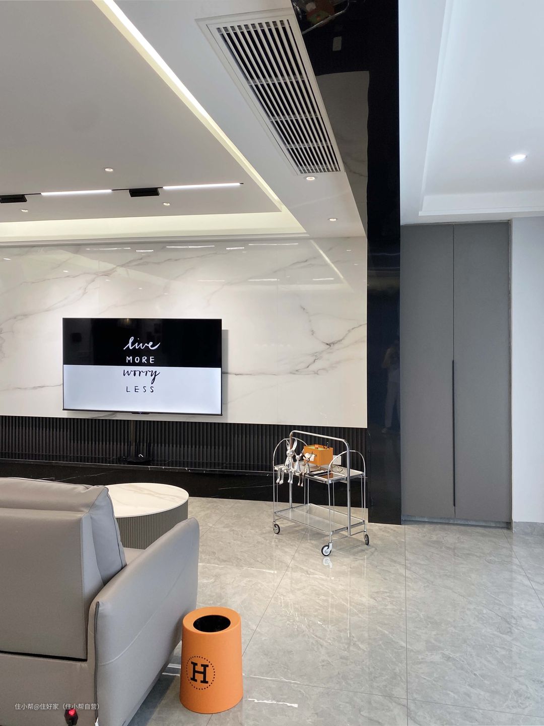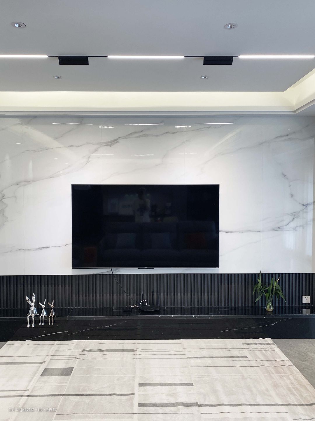 电视背景墙做了简单的造型,简约大气。 拼接大理石盖板,长4.56m,高1.82m,密缝铺贴,里面预埋了隐藏线路,美观实用。 下面是纤维格栅,和大理石很搭,隐藏灯带,满满的氛围感。 地台是黑色大理石台面,高度45cm,深度26cm,可以摆放喜欢的摆件。 黑白复古条纹地毯,2m*2.9m,过度地面和墙面,更有家的温暖。