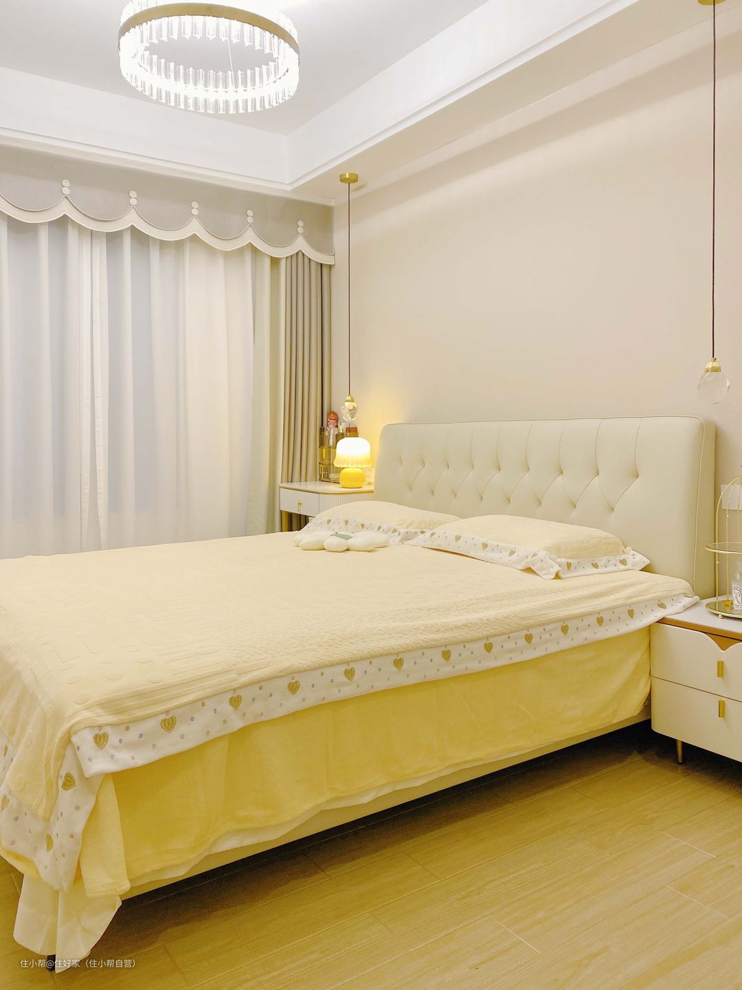 卧室地面铺了木地板,纹路清晰自然,脚感舒适,自然温馨。 墙面是立邦布莱肯棕+杏子灰,干净温柔。 大大的水晶灯,三色灯光可以调节,满足照明需求,电镀不锈钢灯体,满满的轻奢感。 浅卡其色棉麻材质窗帘配白纱,透光不透人,性价比超高。