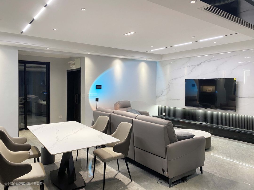 客厅属于横厅,6.9m*4.8m,层高2.8m。 与阳台打通,做了大大的落地窗,通透敞亮。 地面通铺了750*1500mm的中灰色亮面砖,灰度刚刚好, 不仅不影响采光,还显得家里十分亮堂,同色系美缝,视觉上更统一。 悬浮吊顶,整体满吊下降10cm,四周边吊下降30cm,也给空调留足了出风口。 暗藏灯带,搭配两条3m长的磁吸轨道灯和小山丘射灯,色温4000K,层次分明。 墙面颜色是网红色太空漫步,浅浅的灰色、瓷砖内嵌踢脚线和整体风格相融合。